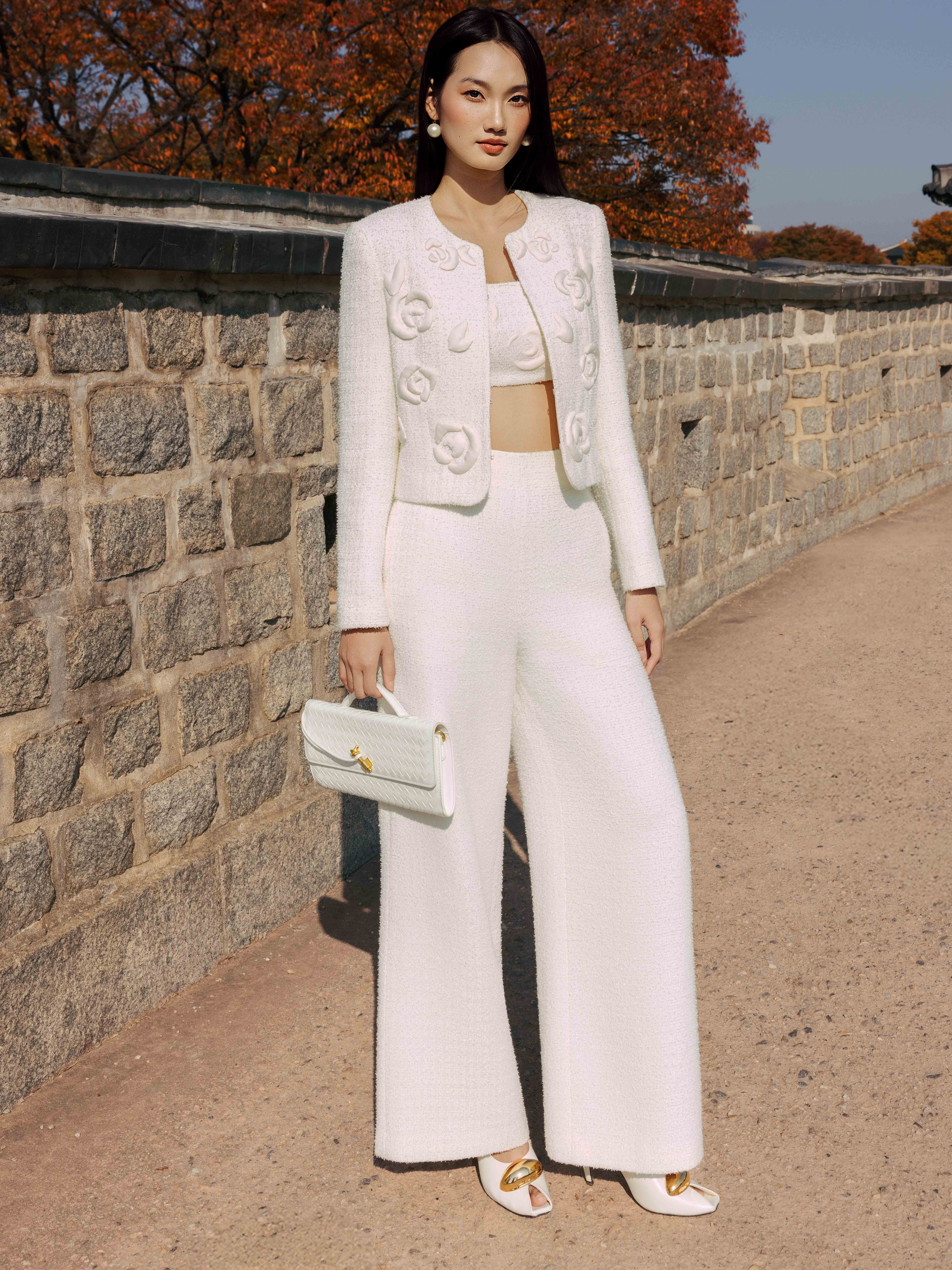 - Chi tiết thiết kế: Áo vest ngắn thêu chi tiết hoa nổi bản to ấn tượng.