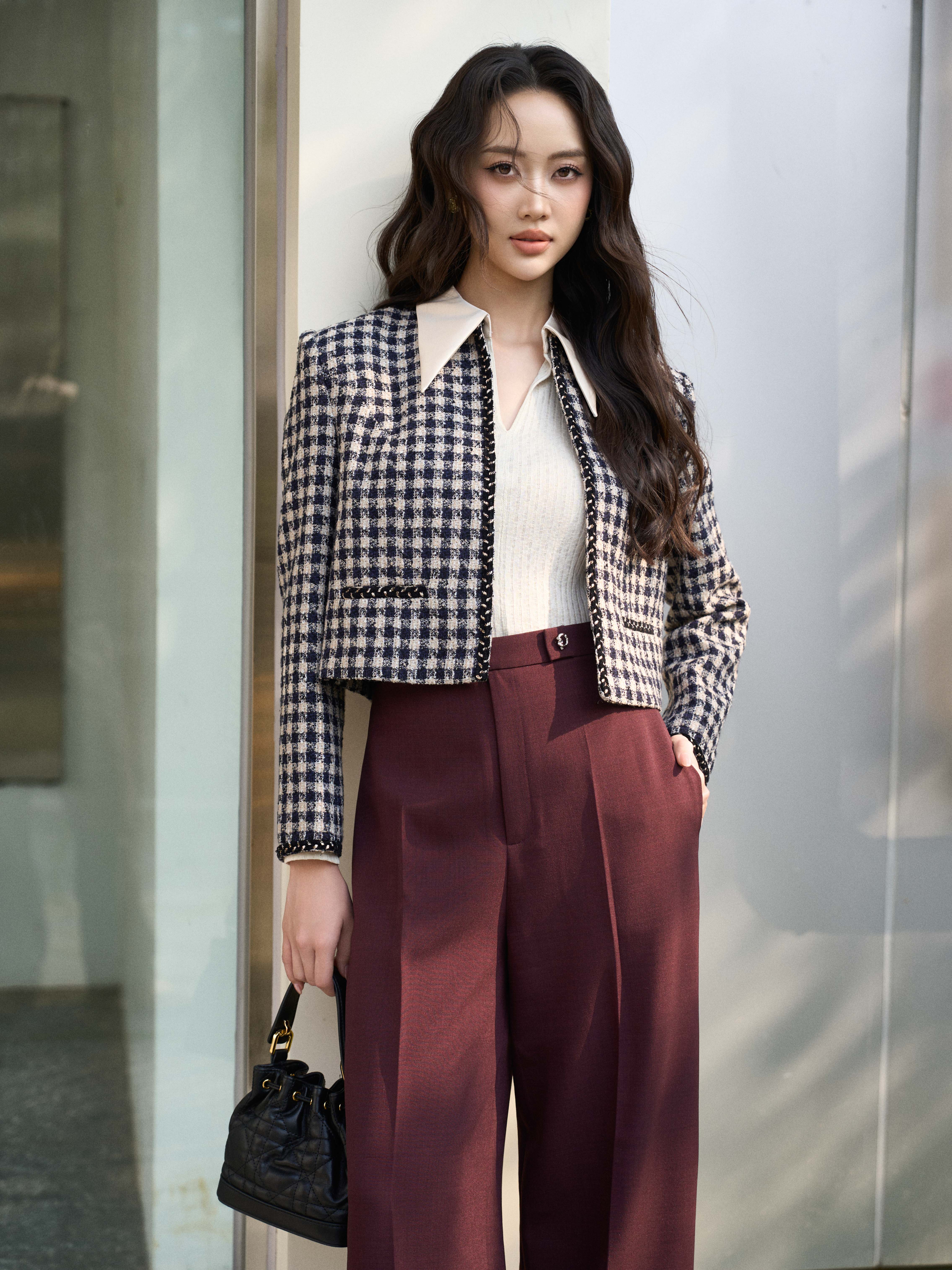- Chi tiết thiết kế: Áo dạ tweed kẻ ô vuông phối viền