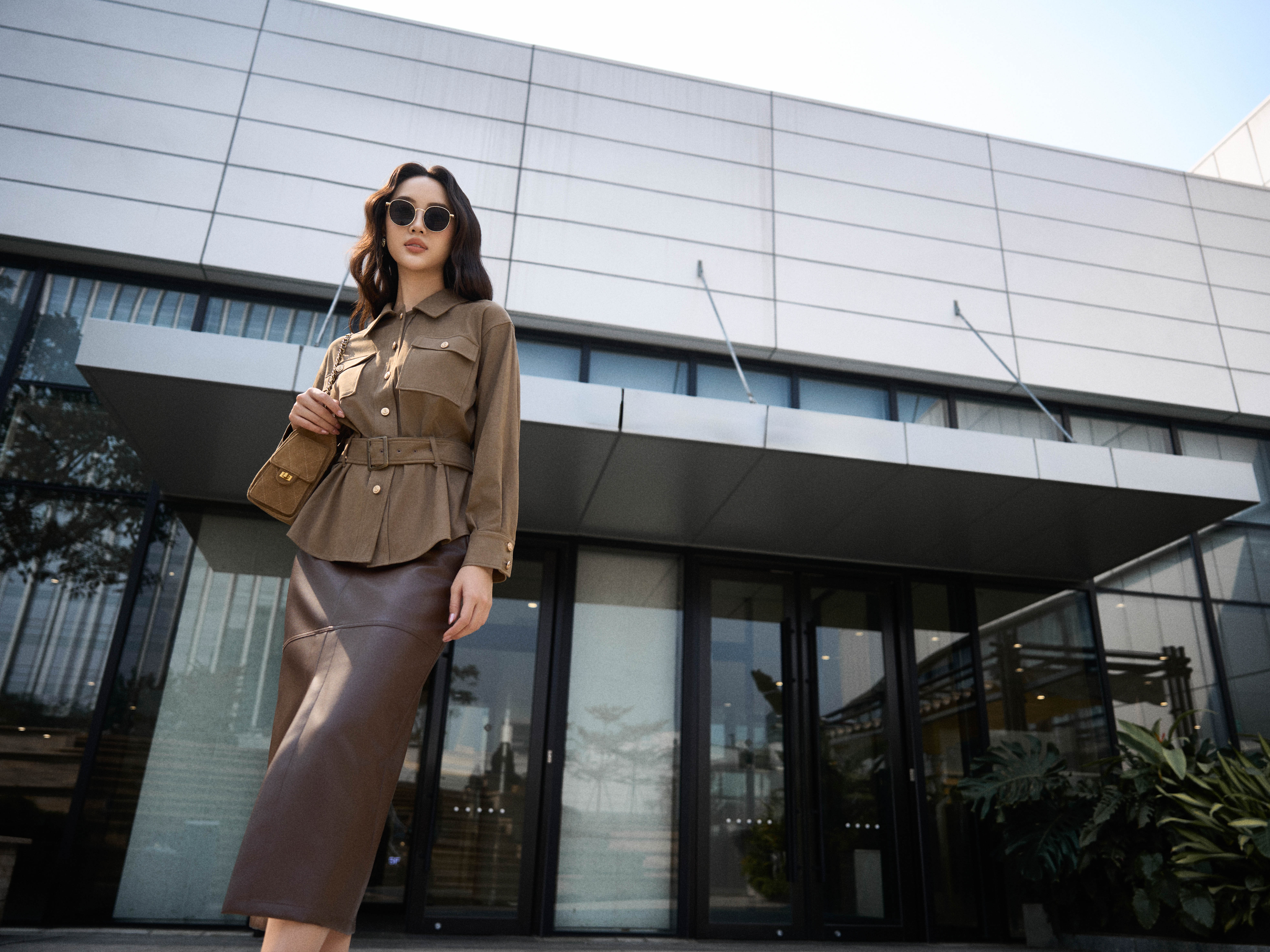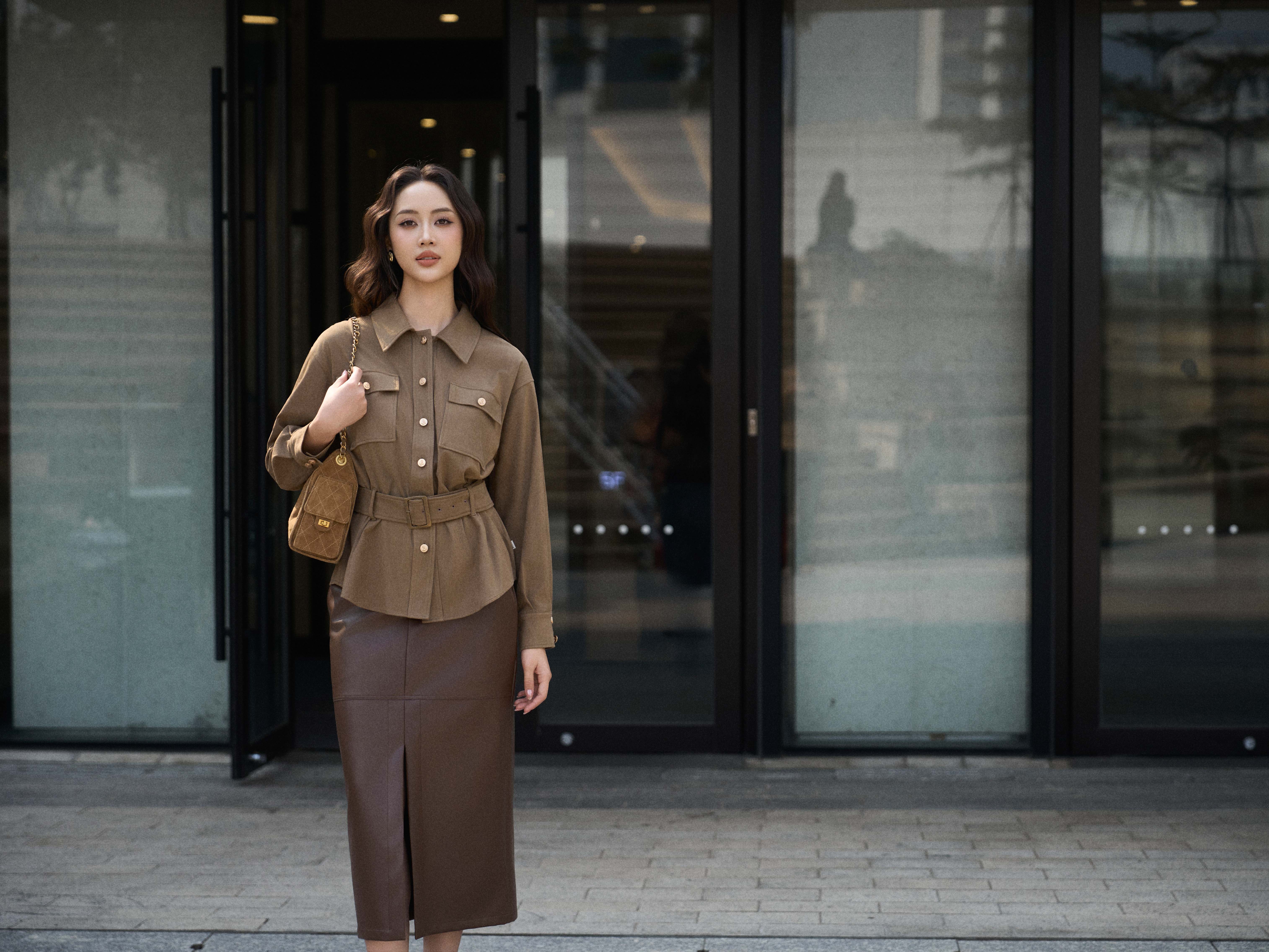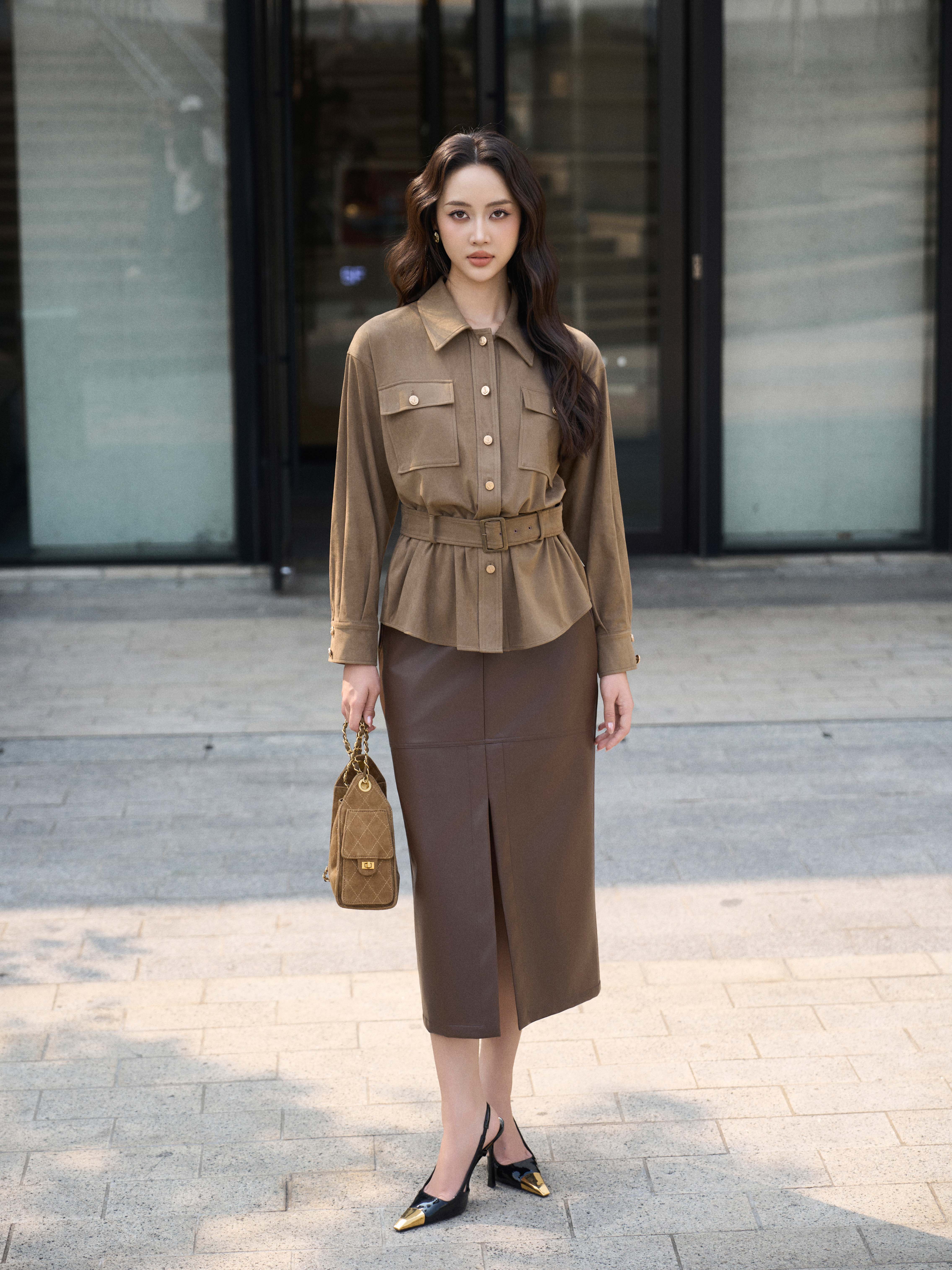 - Chi tiết thiết kế: Đính cúc kim loại, Áo da lộn túi ngực có dây đai