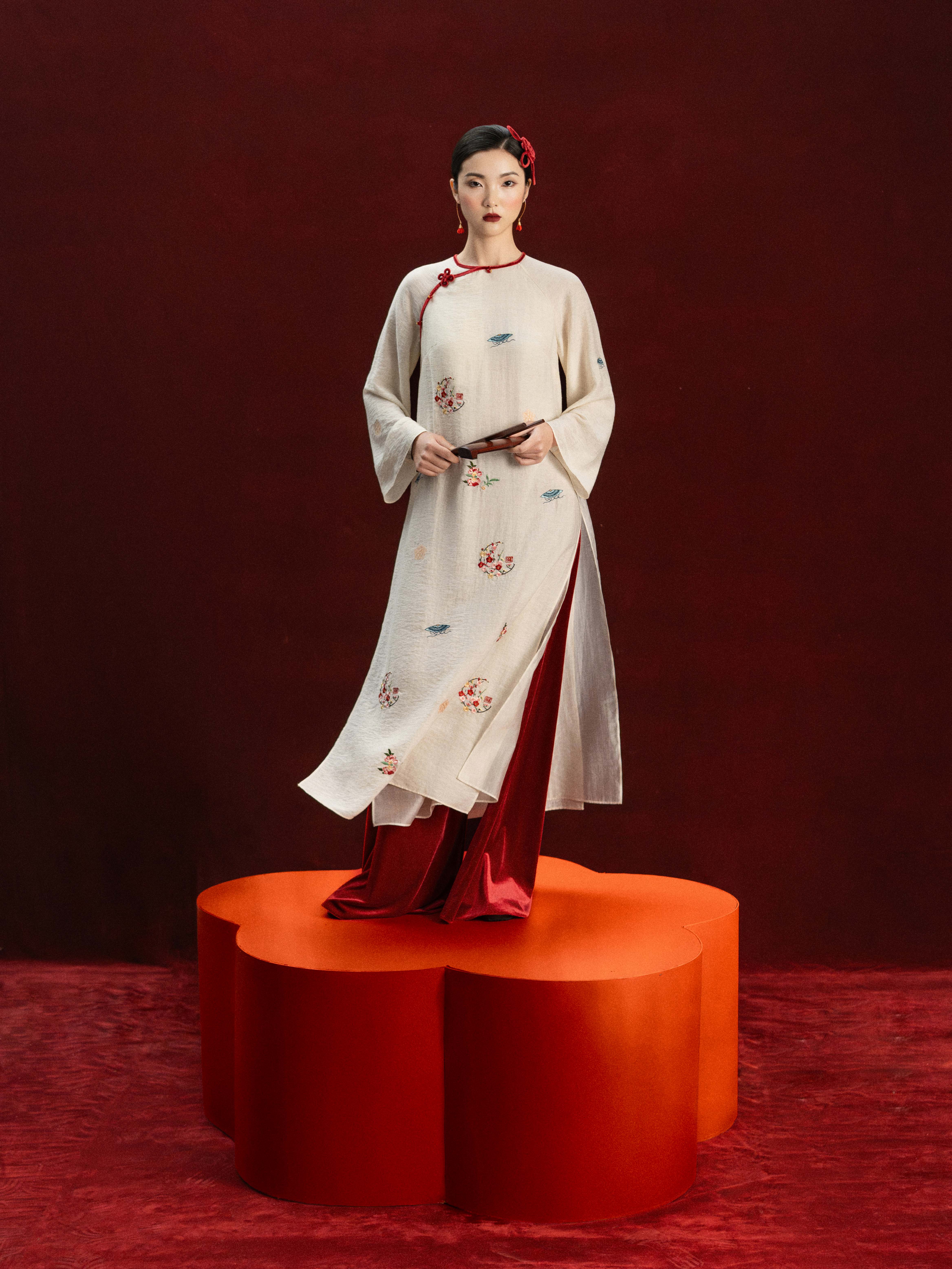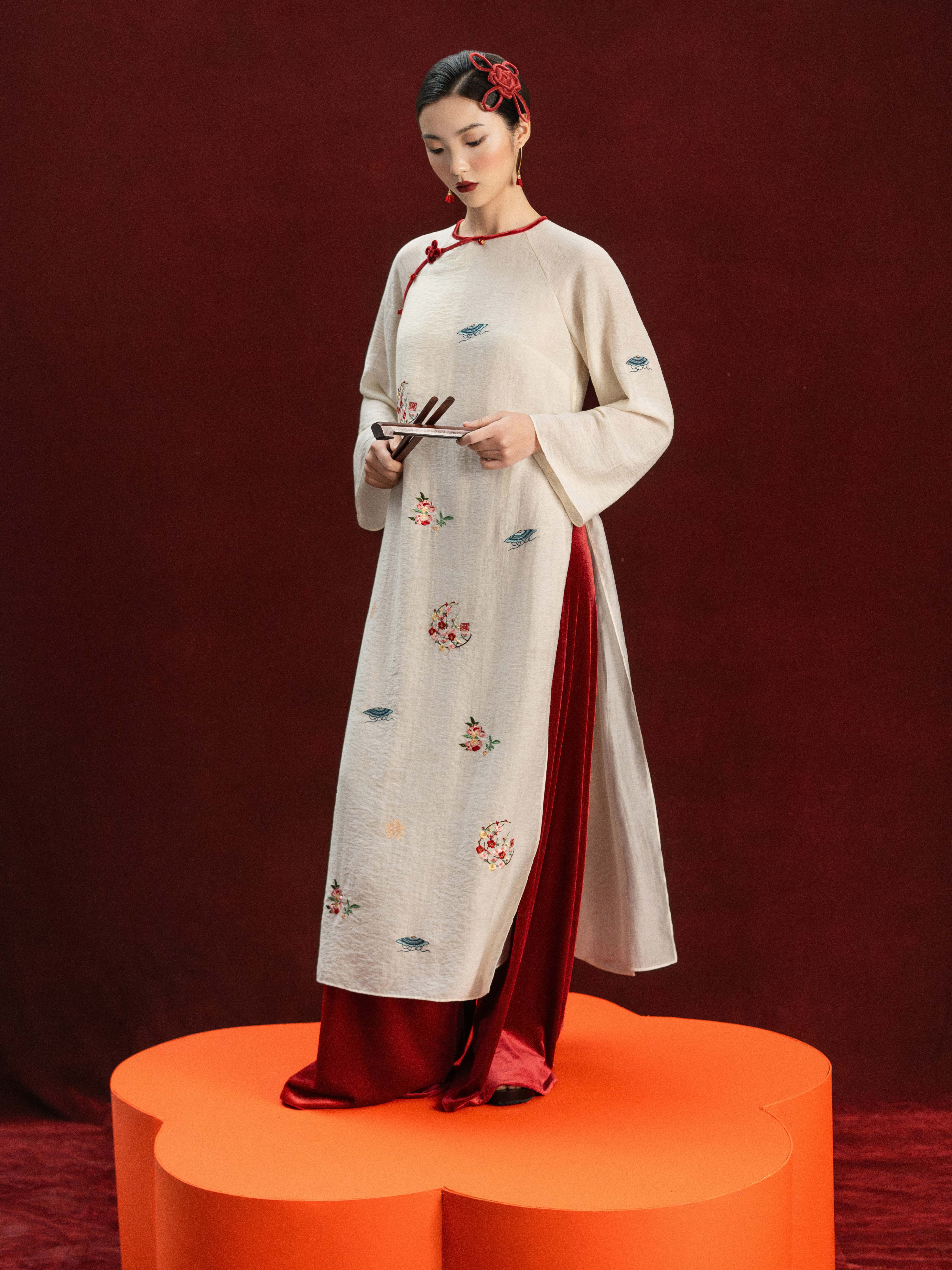 - Chi tiết thiết kế: Cổ trụ thấp, tay dài loe nhẹ