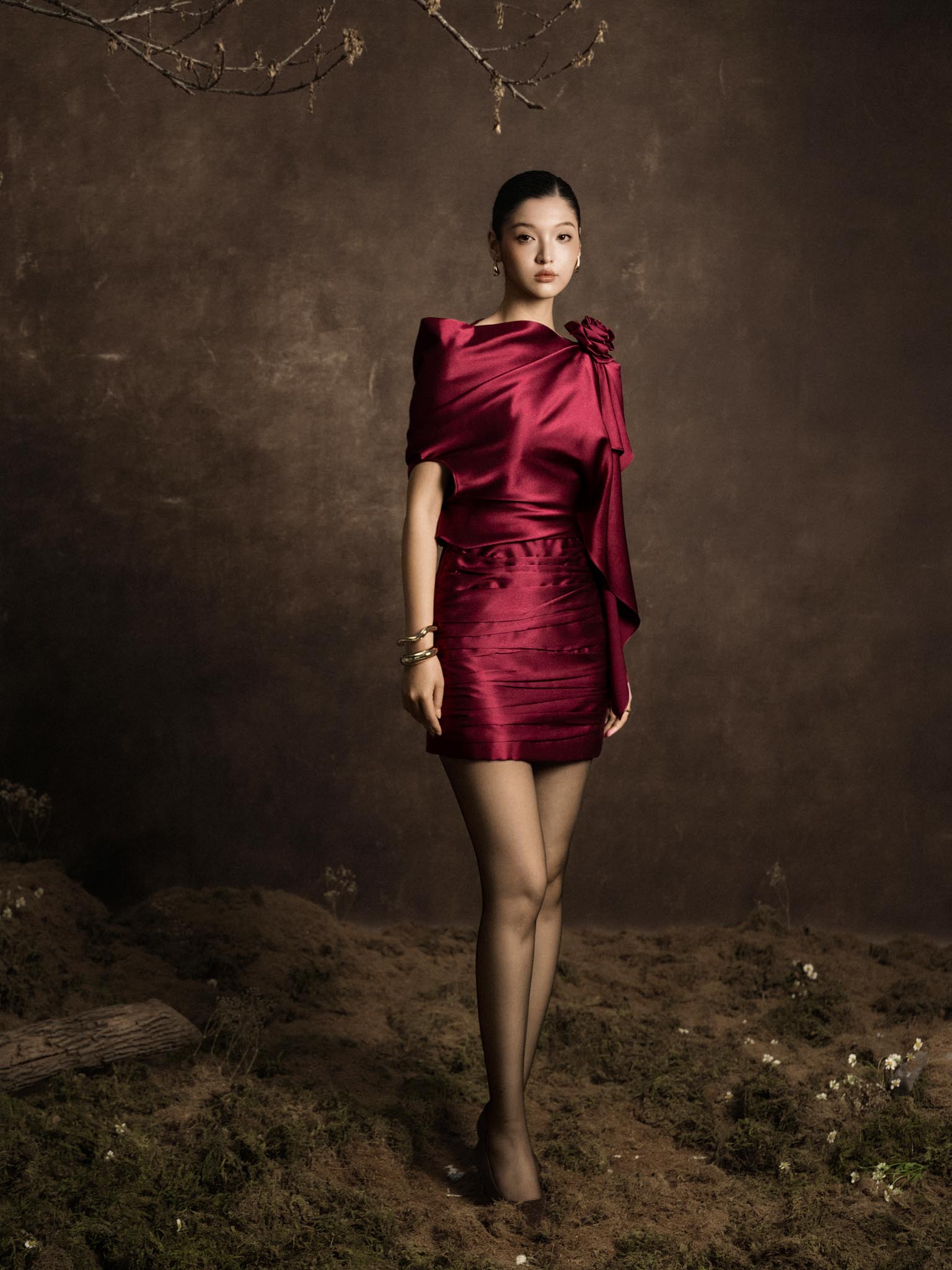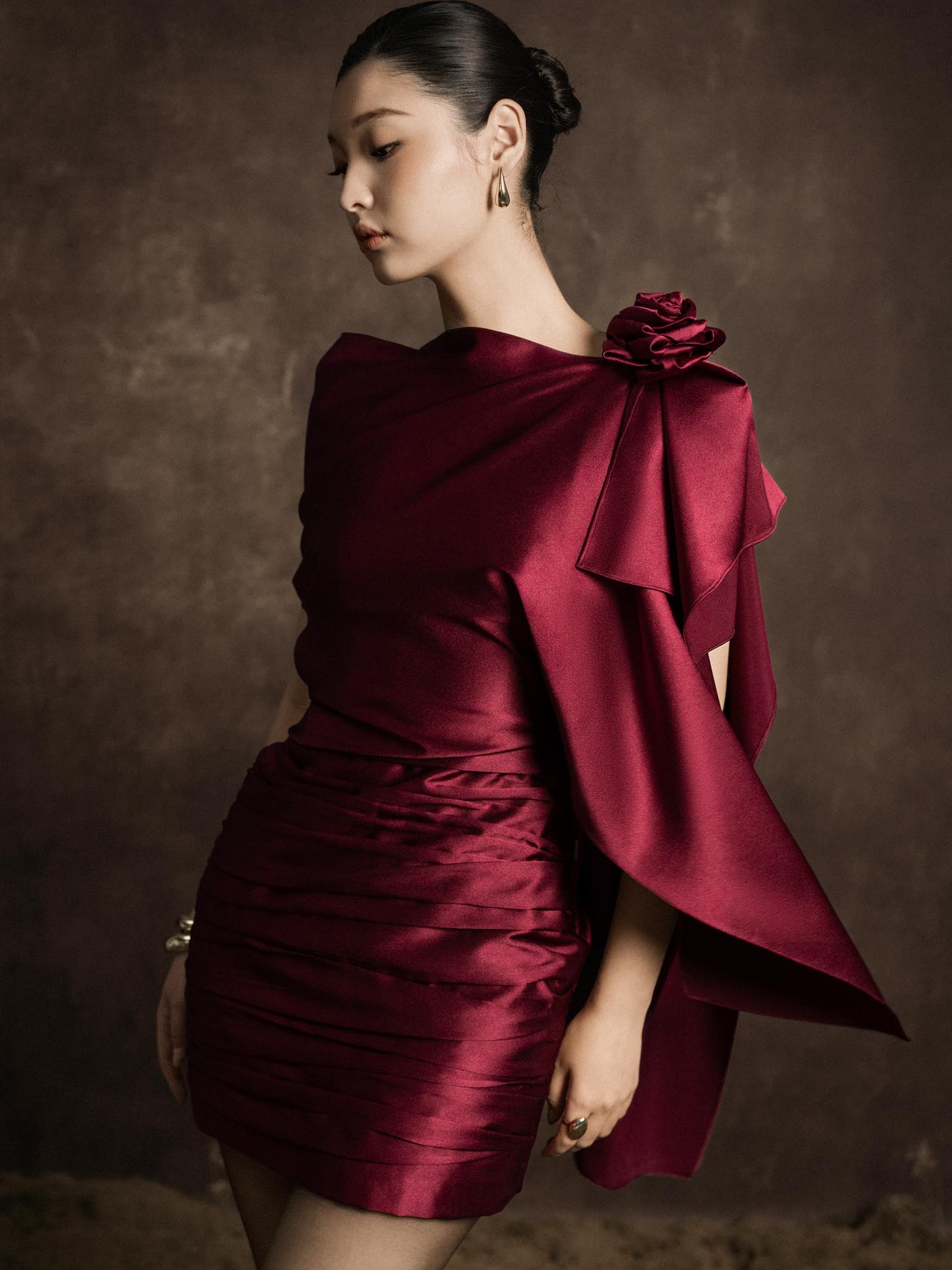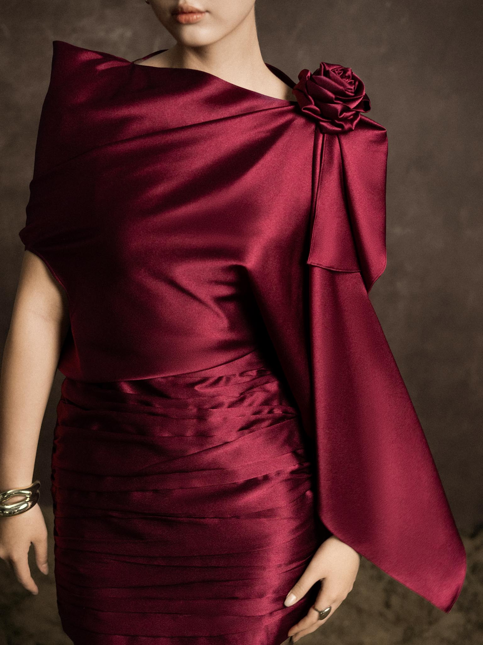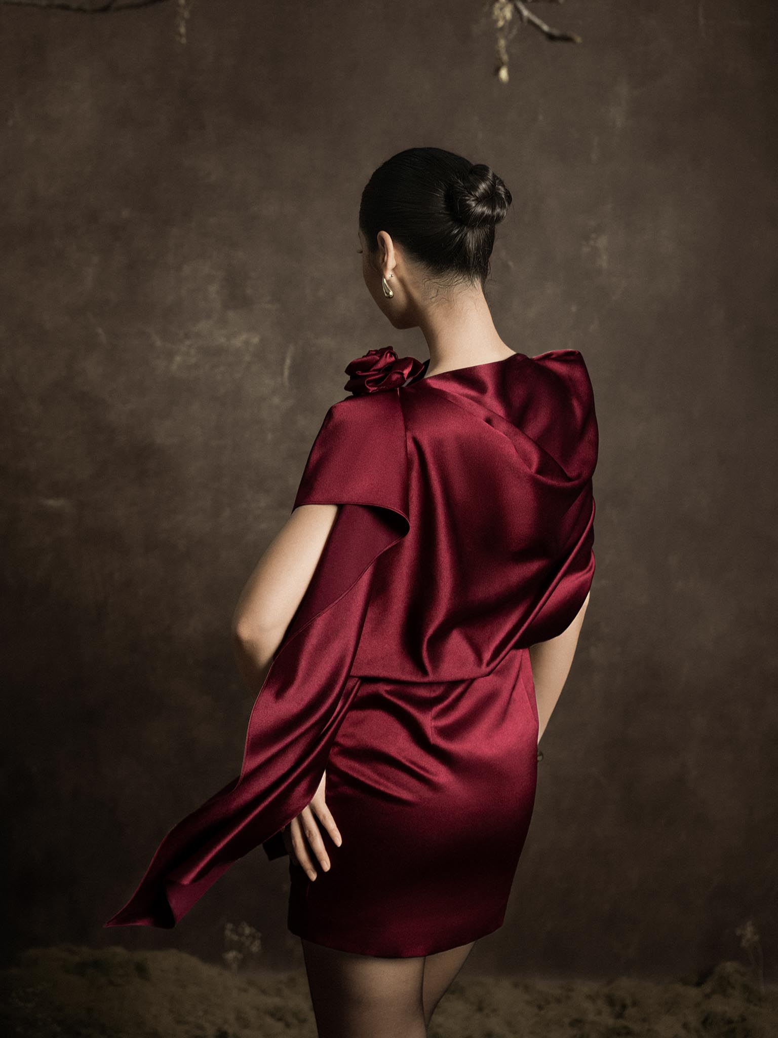 - Chi tiết thiết kế: Váy vạt lệch cài hoa dây dài.