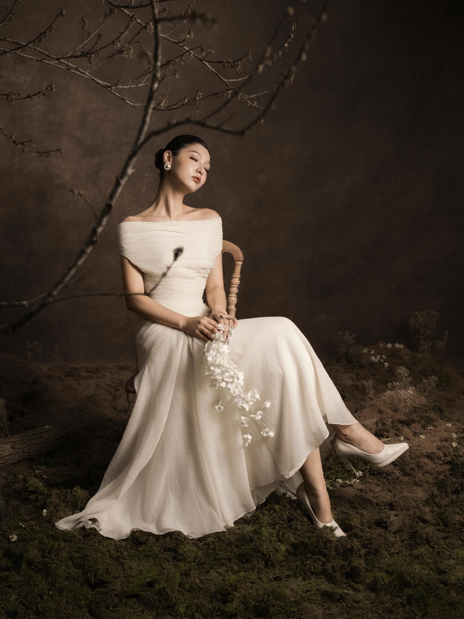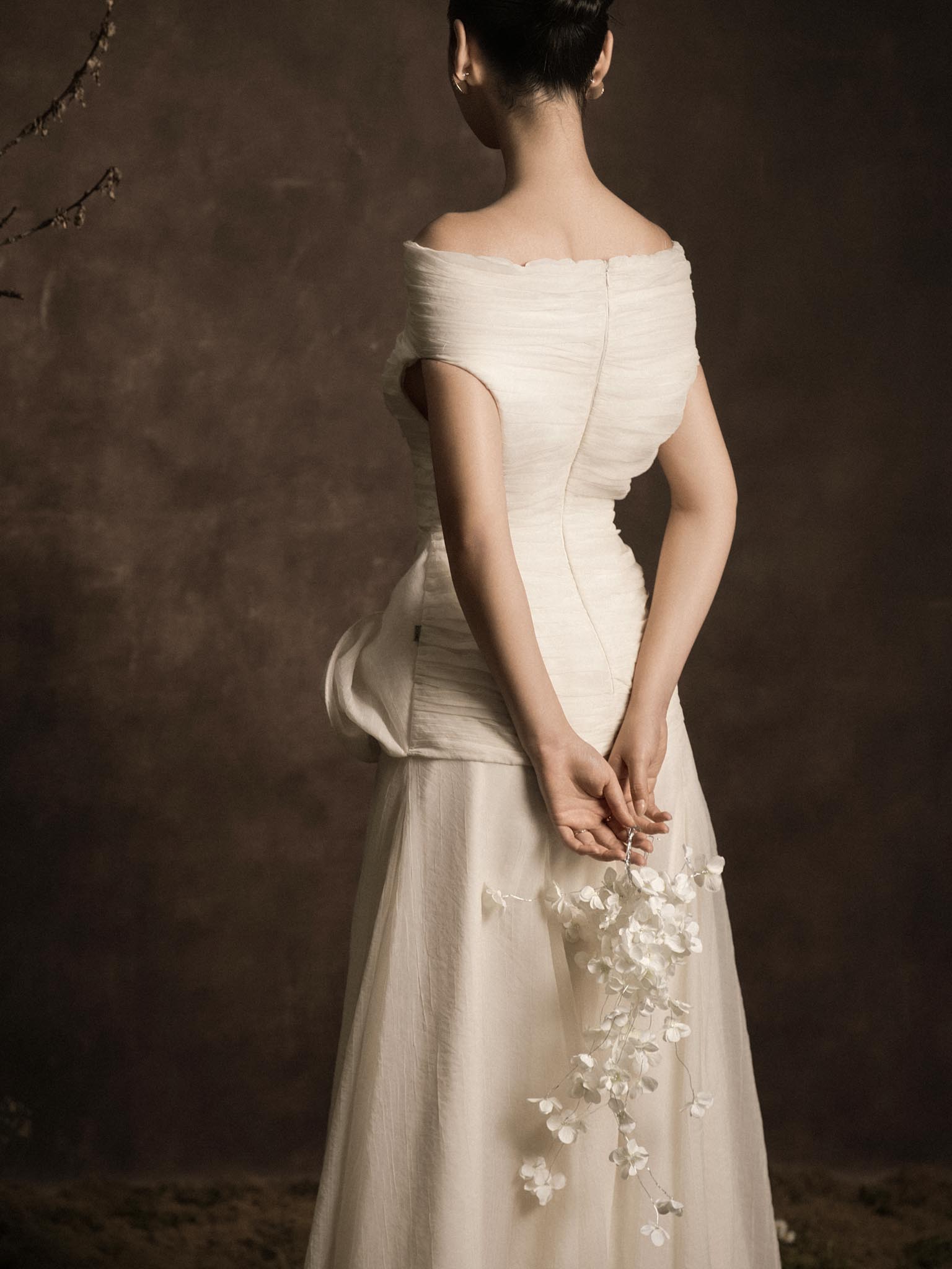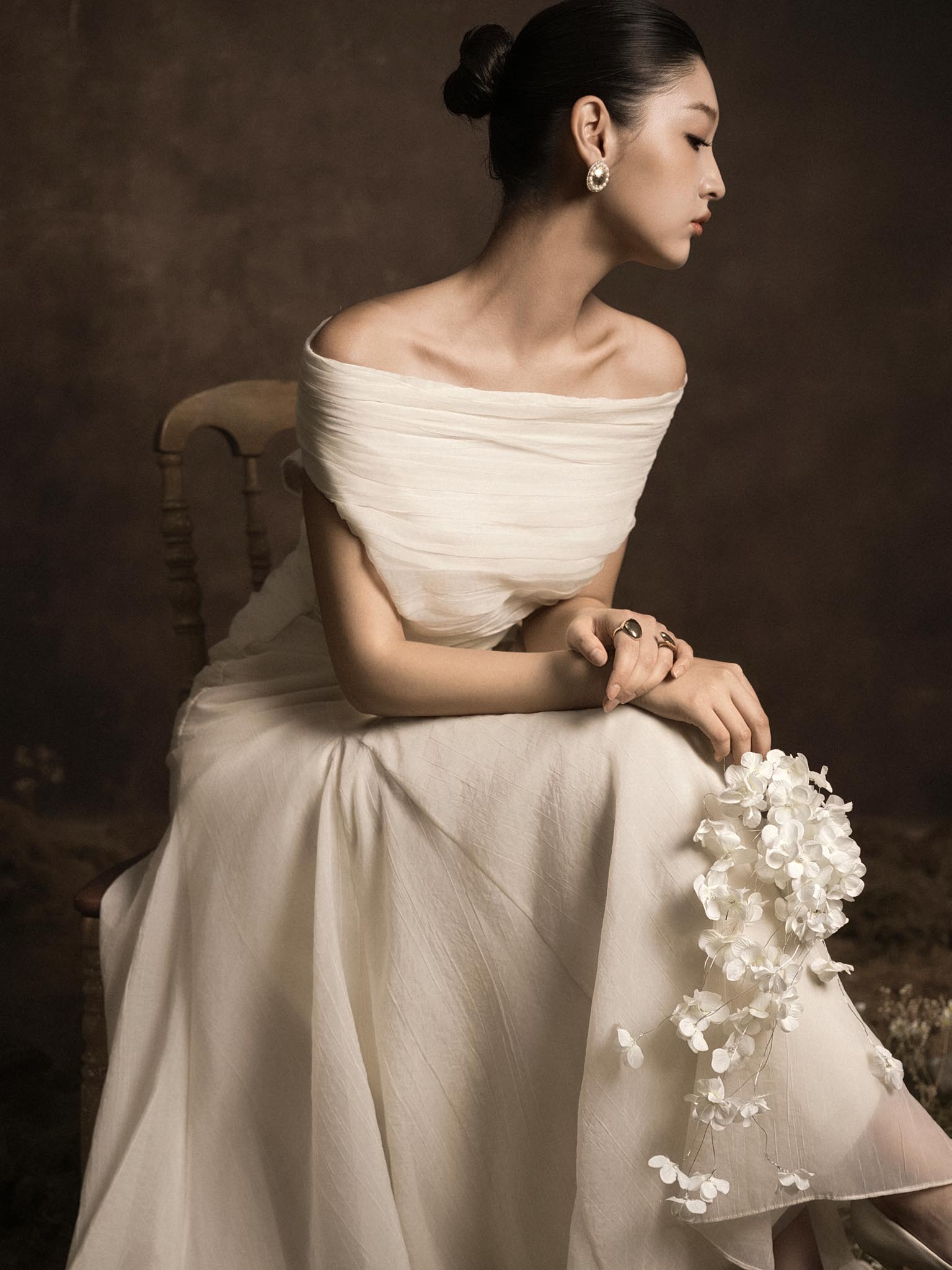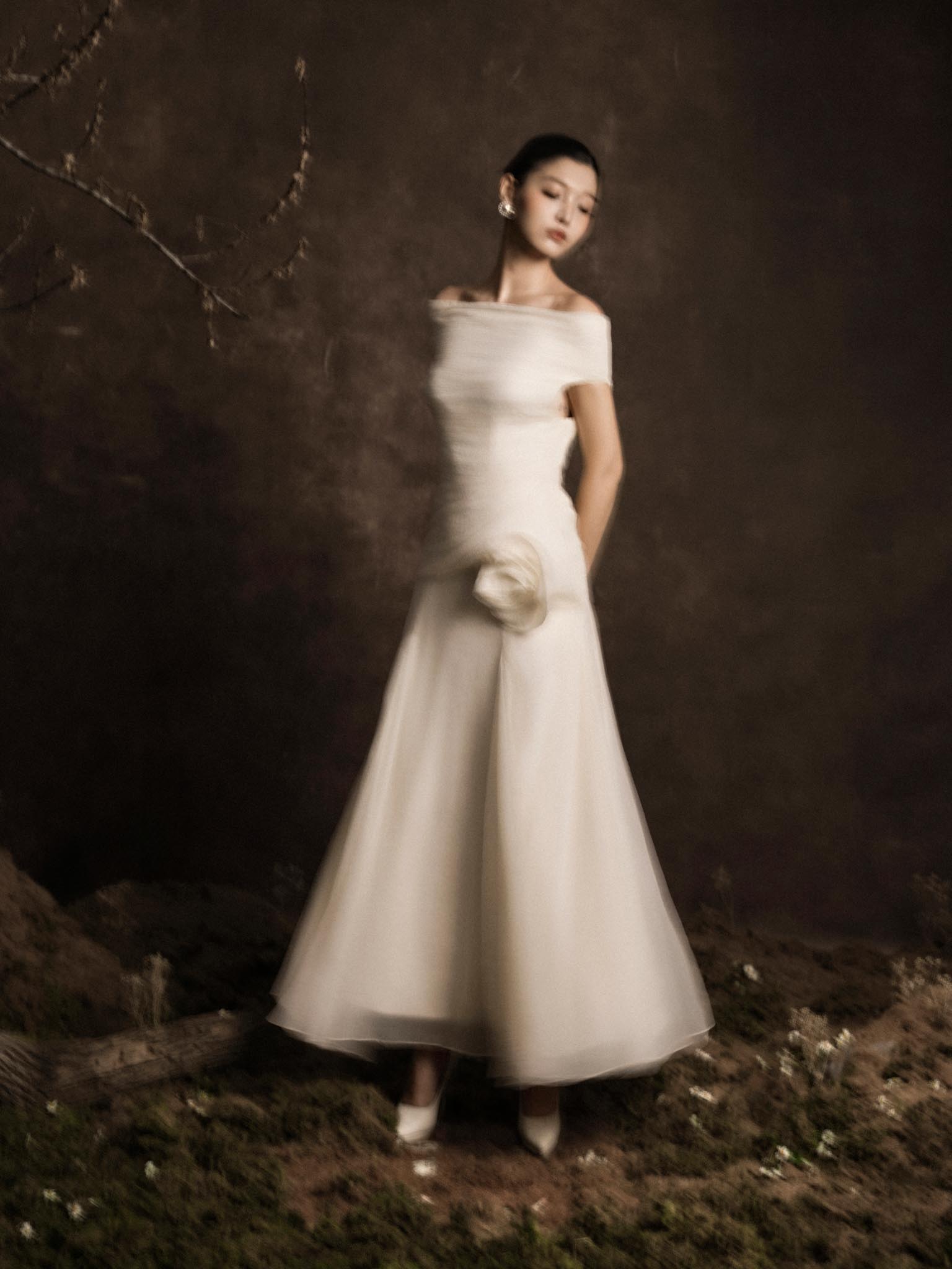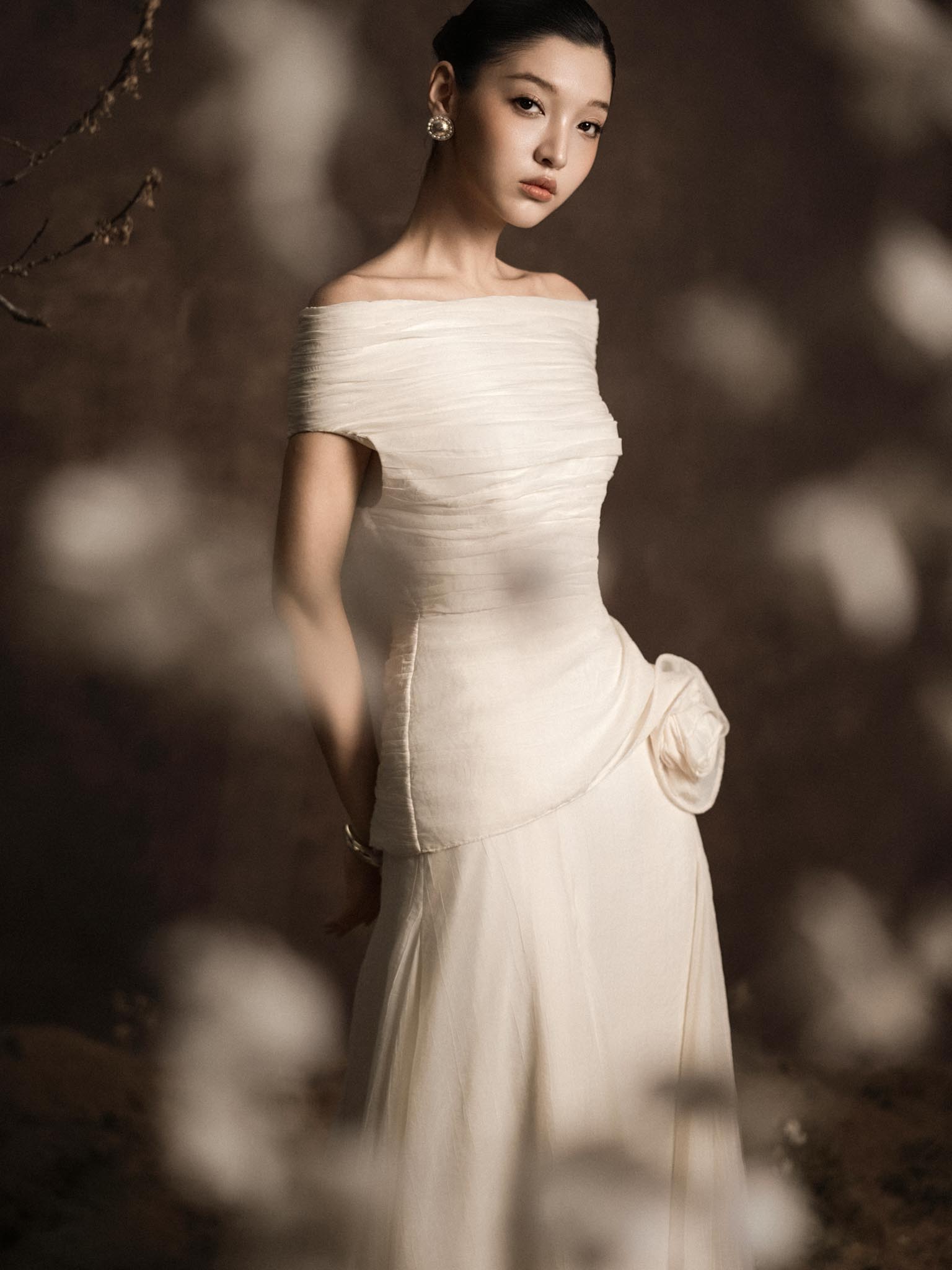 - Chi tiết thiết kế: Váy trễ vai, đính kết chi tiết hoa hồng, hoạ tiết xếp ly, chân váy xoè bồng.