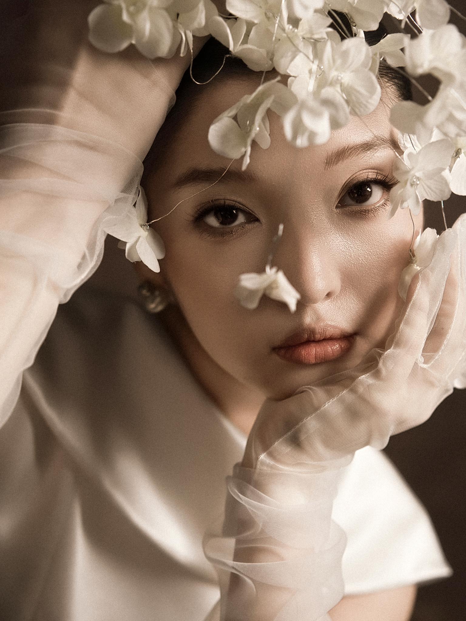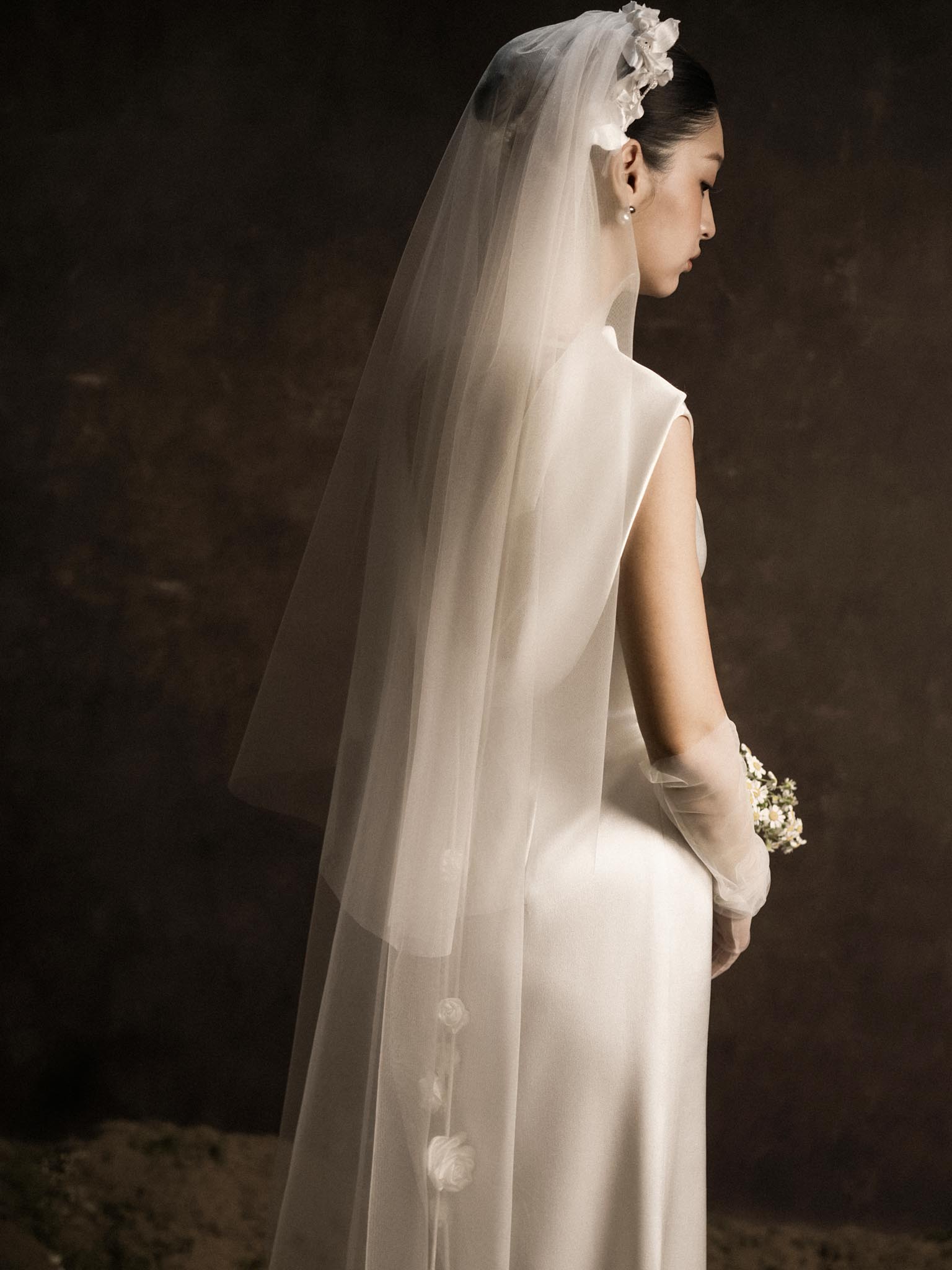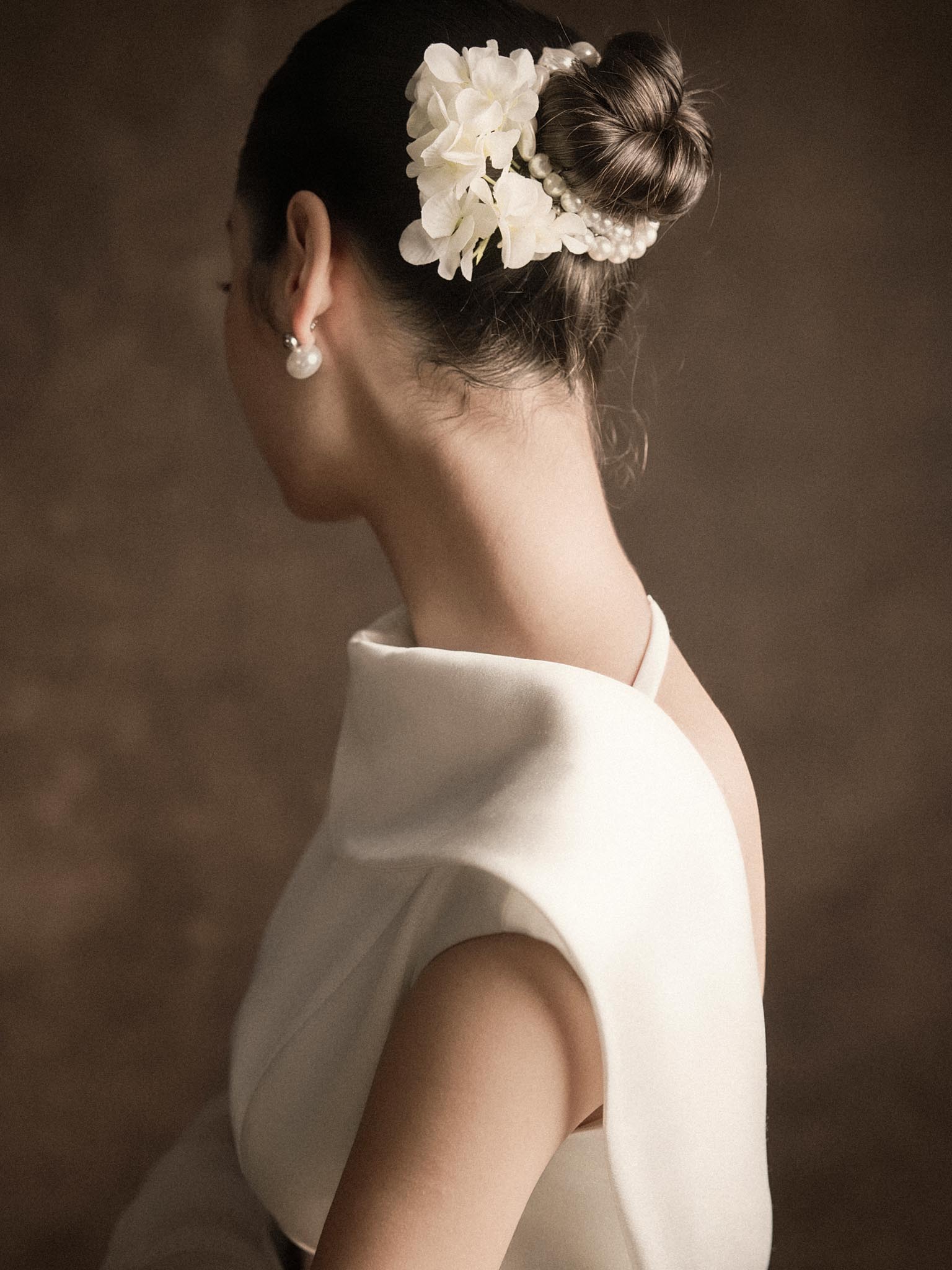 - Chi tiết thiết kế: Váy dáng dài cổ thuyền khoét lưng, có dây tết hoạ tiết hoa thủ công phối nổi bật.