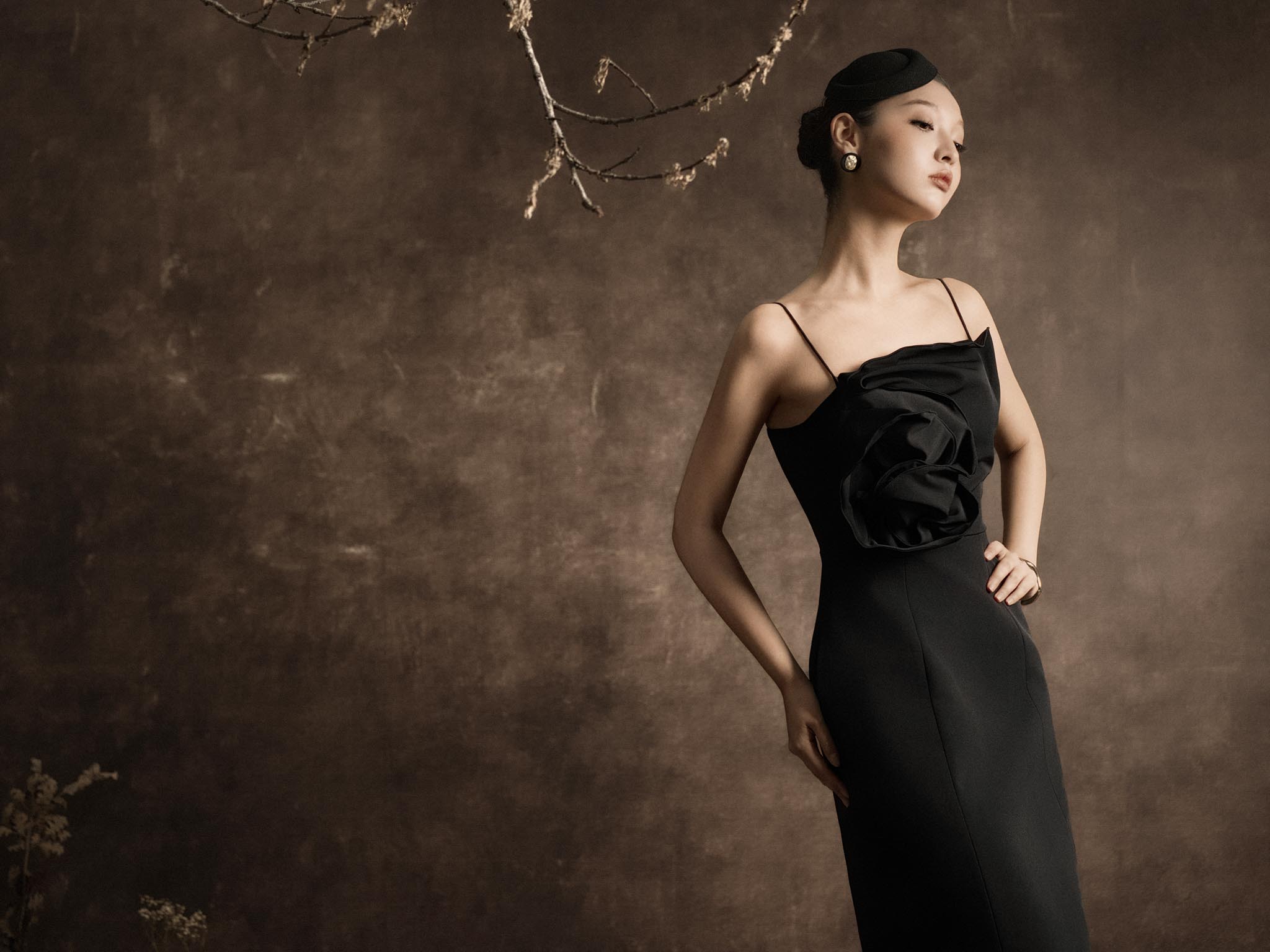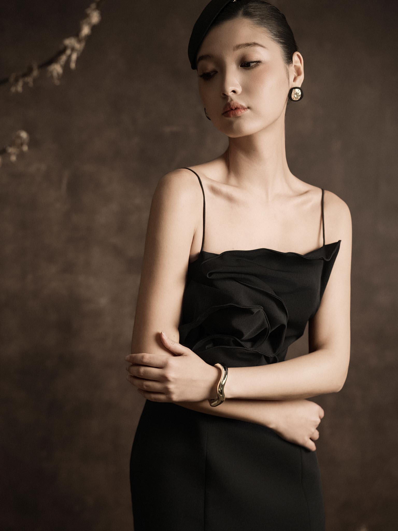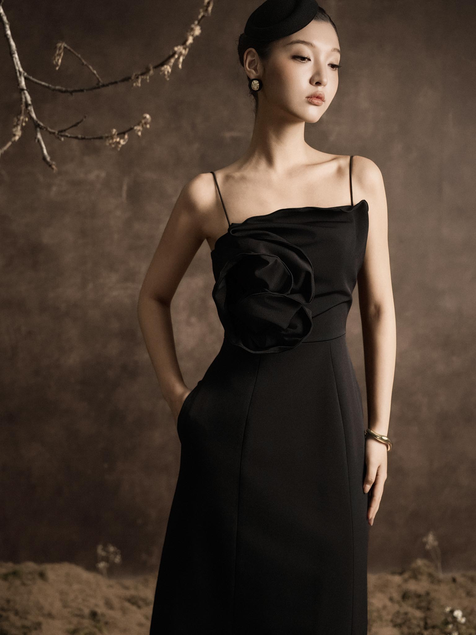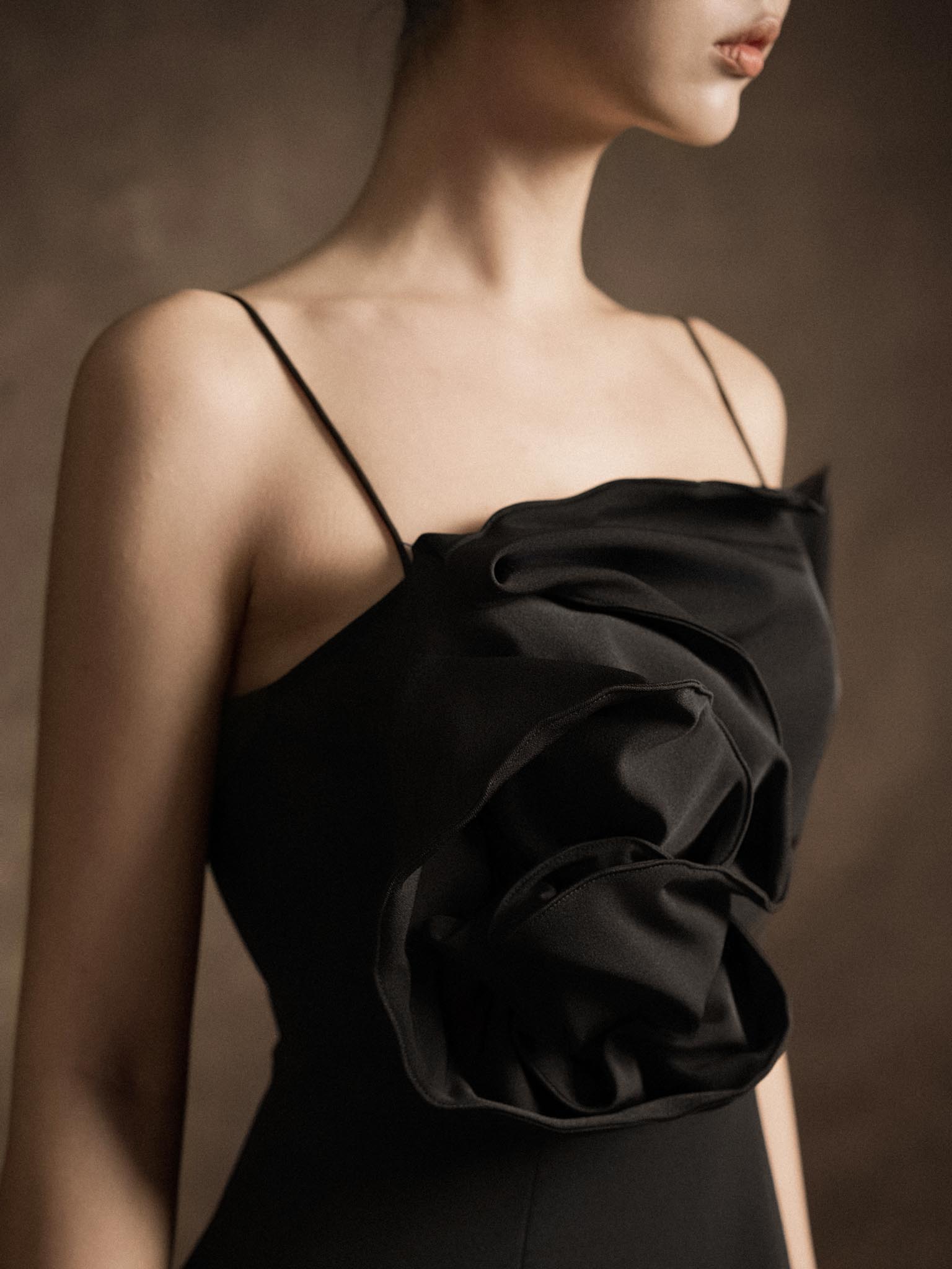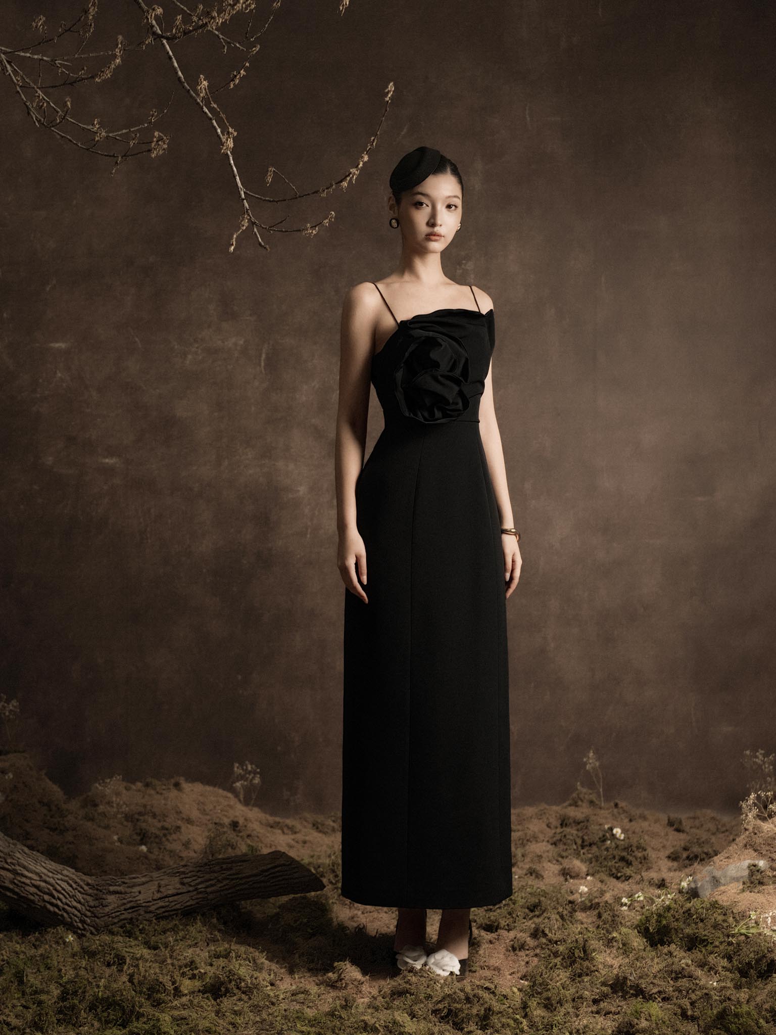 - Chi tiết thiết kế: Váy hai dây, phía trước ngực có đính kết hoạ tiết hoa hồng bản to nổi bật.
