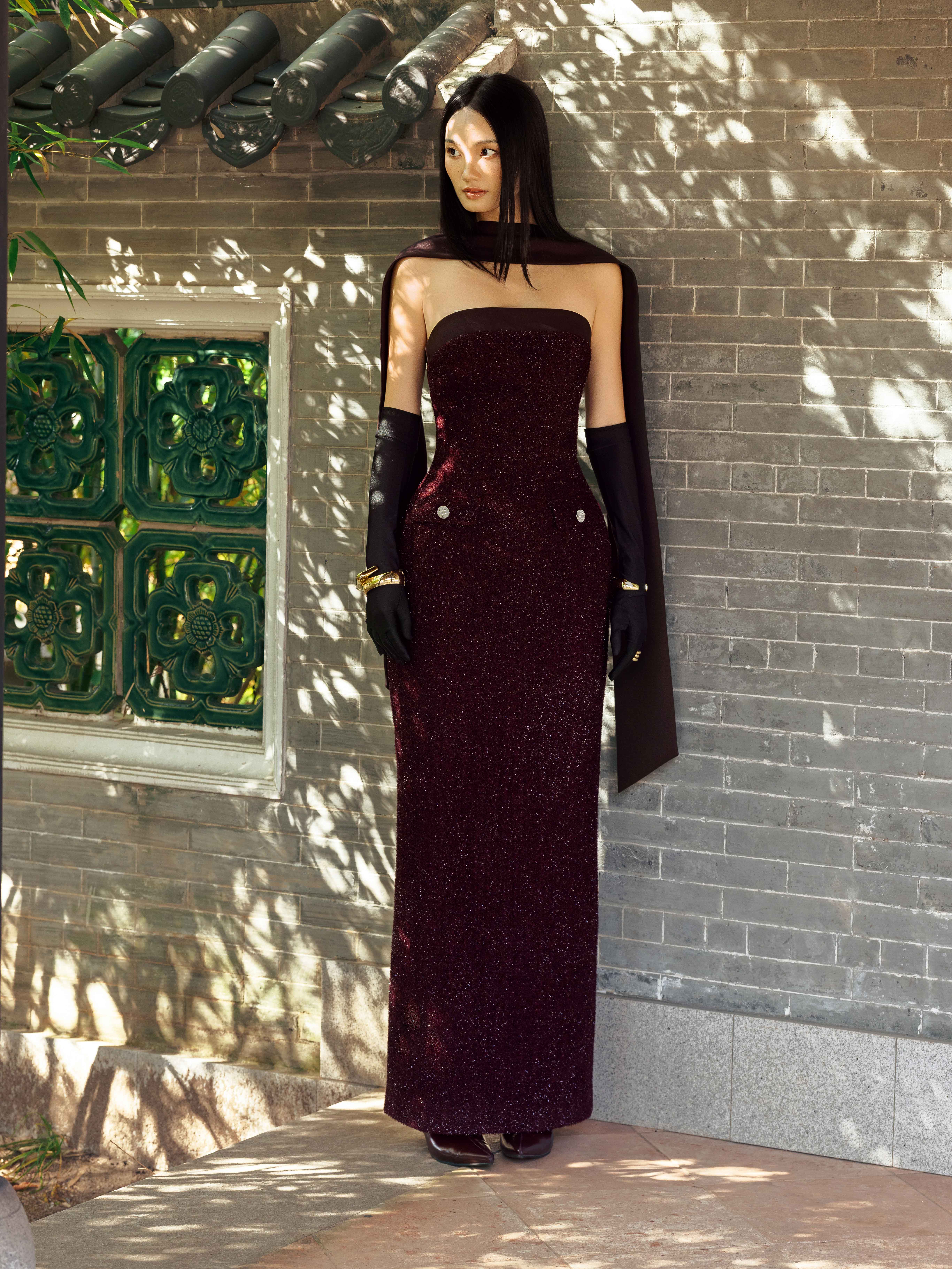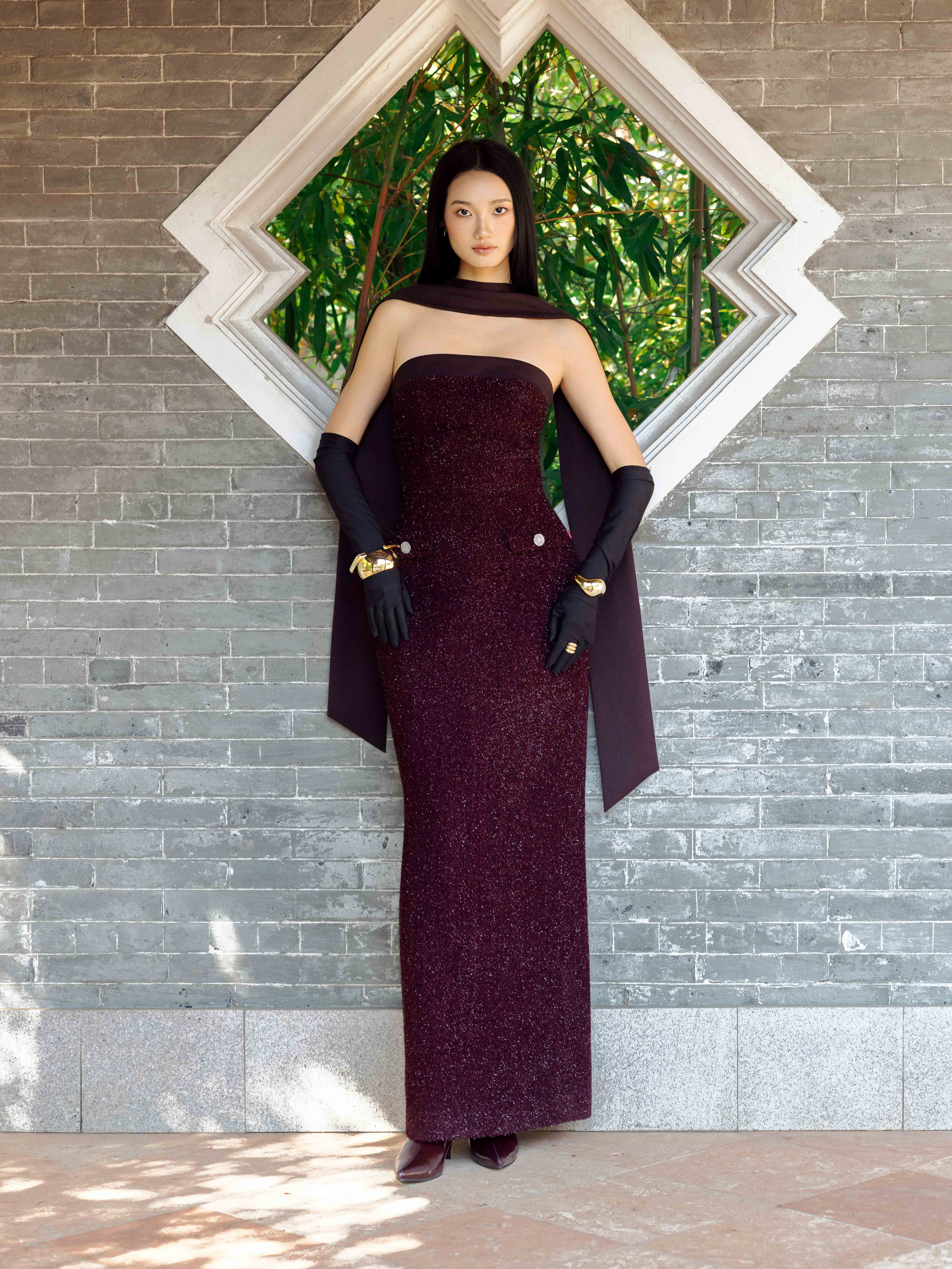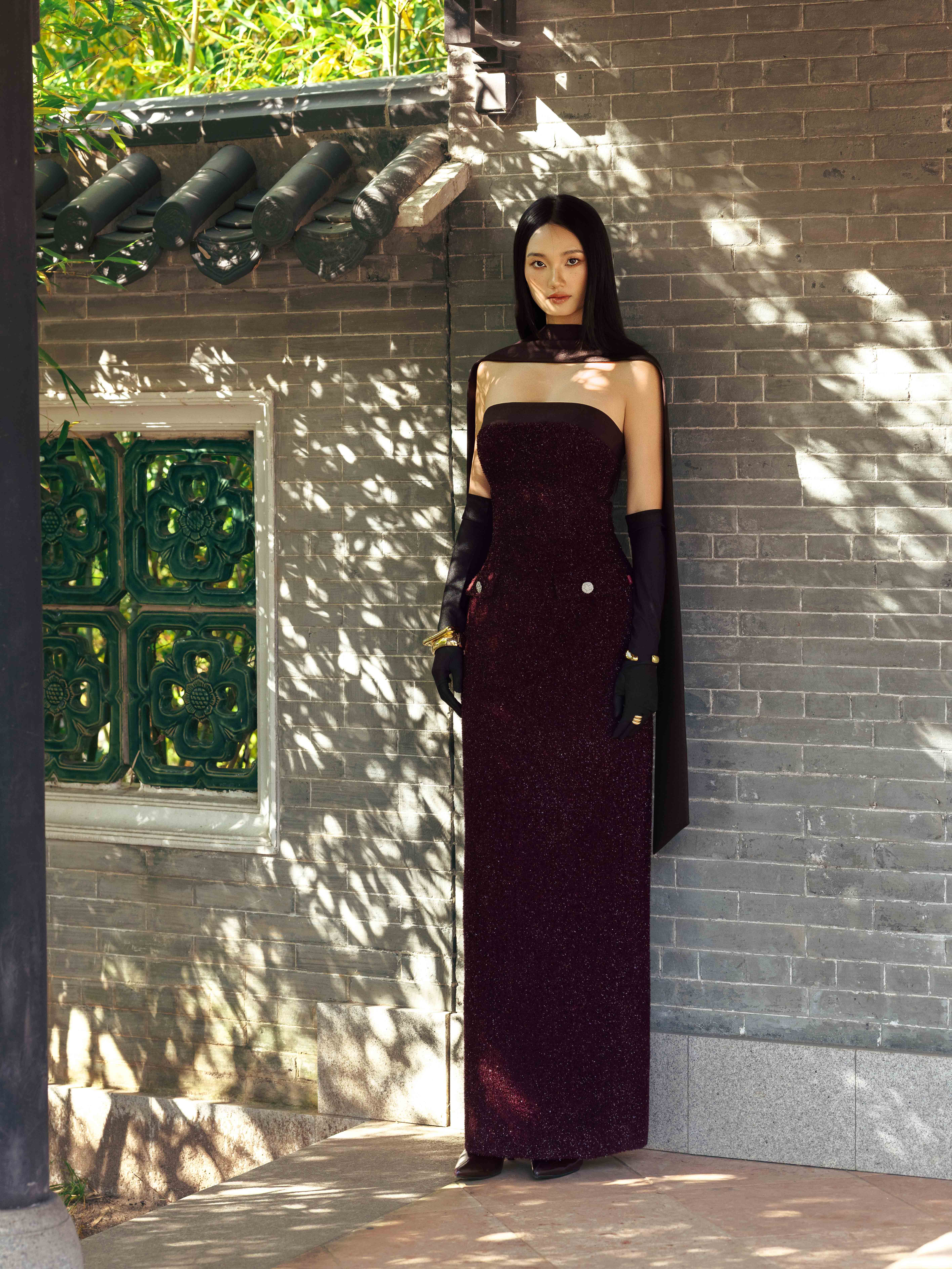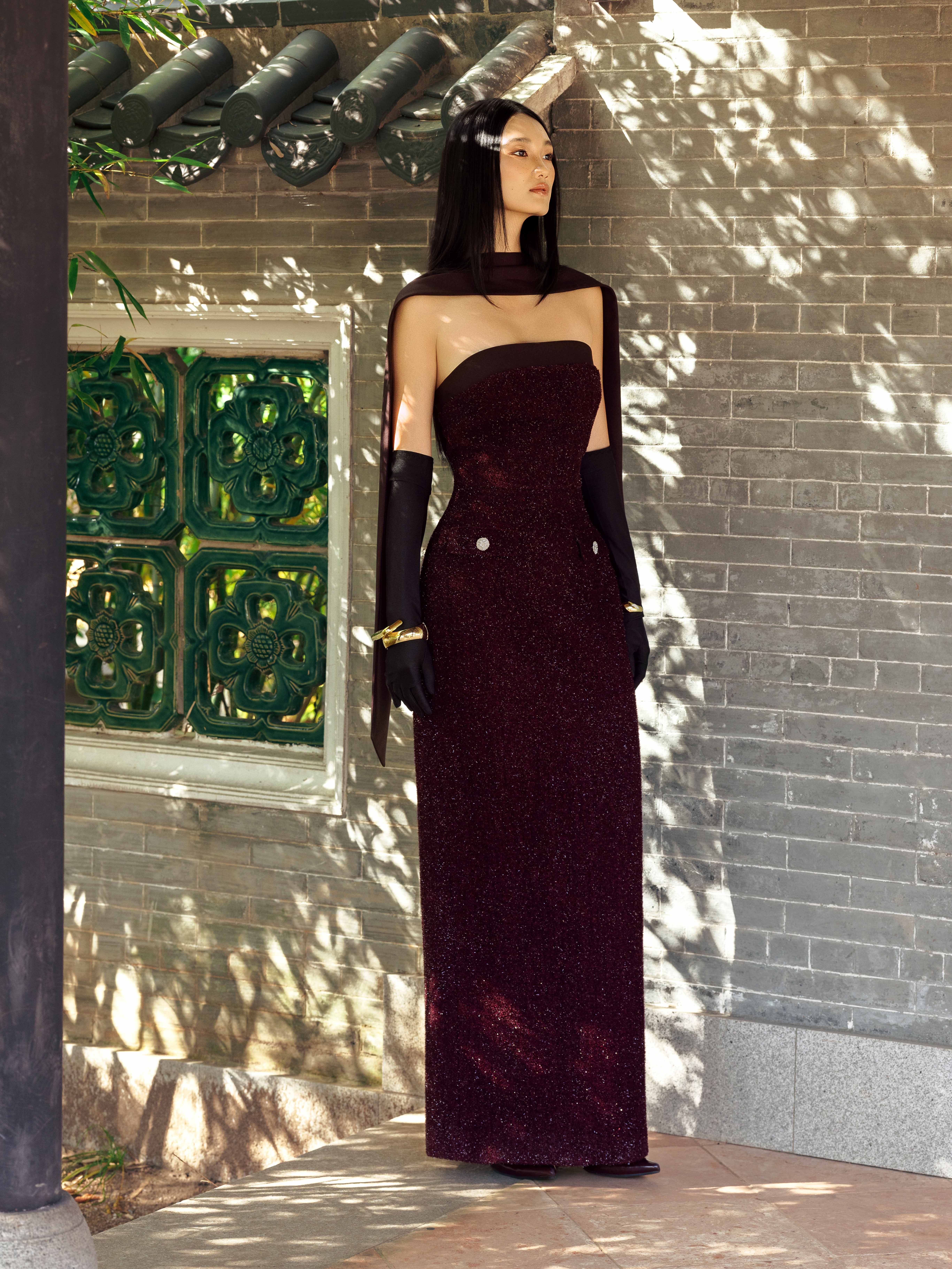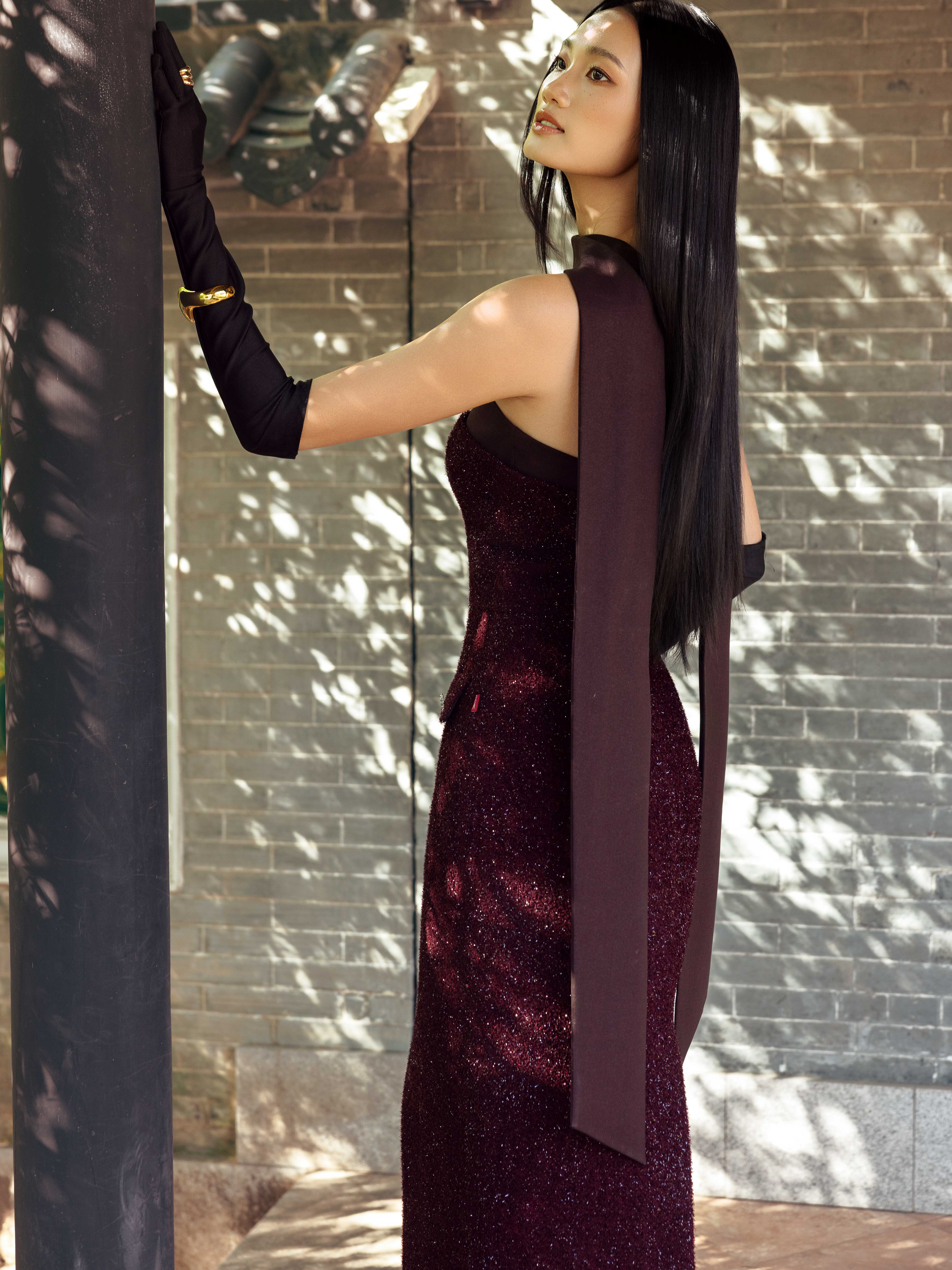 - Chi tiết thiết kế: Kèm khăn dài đen, đính kết sợi hiệu ứng lấp lánh,