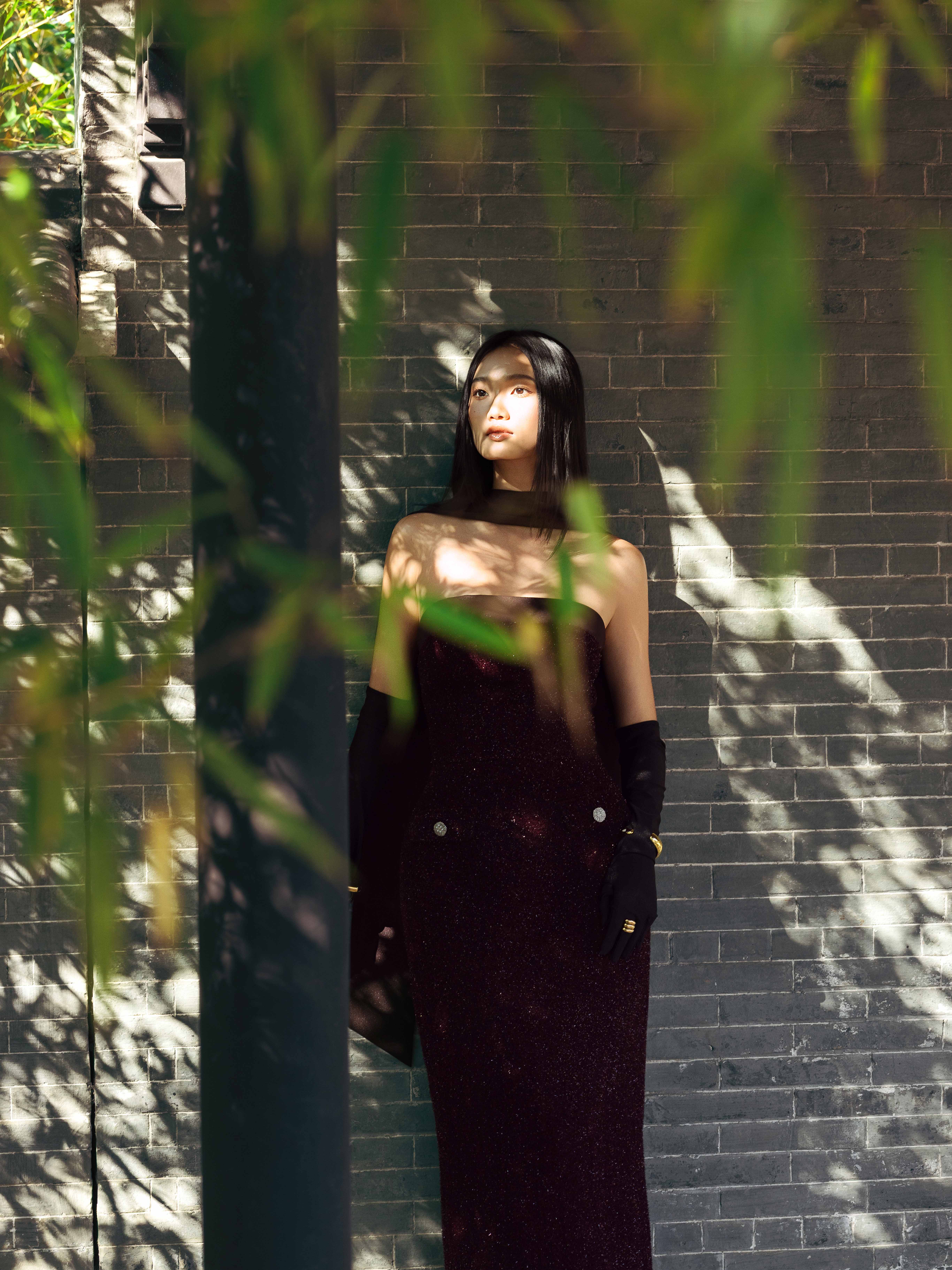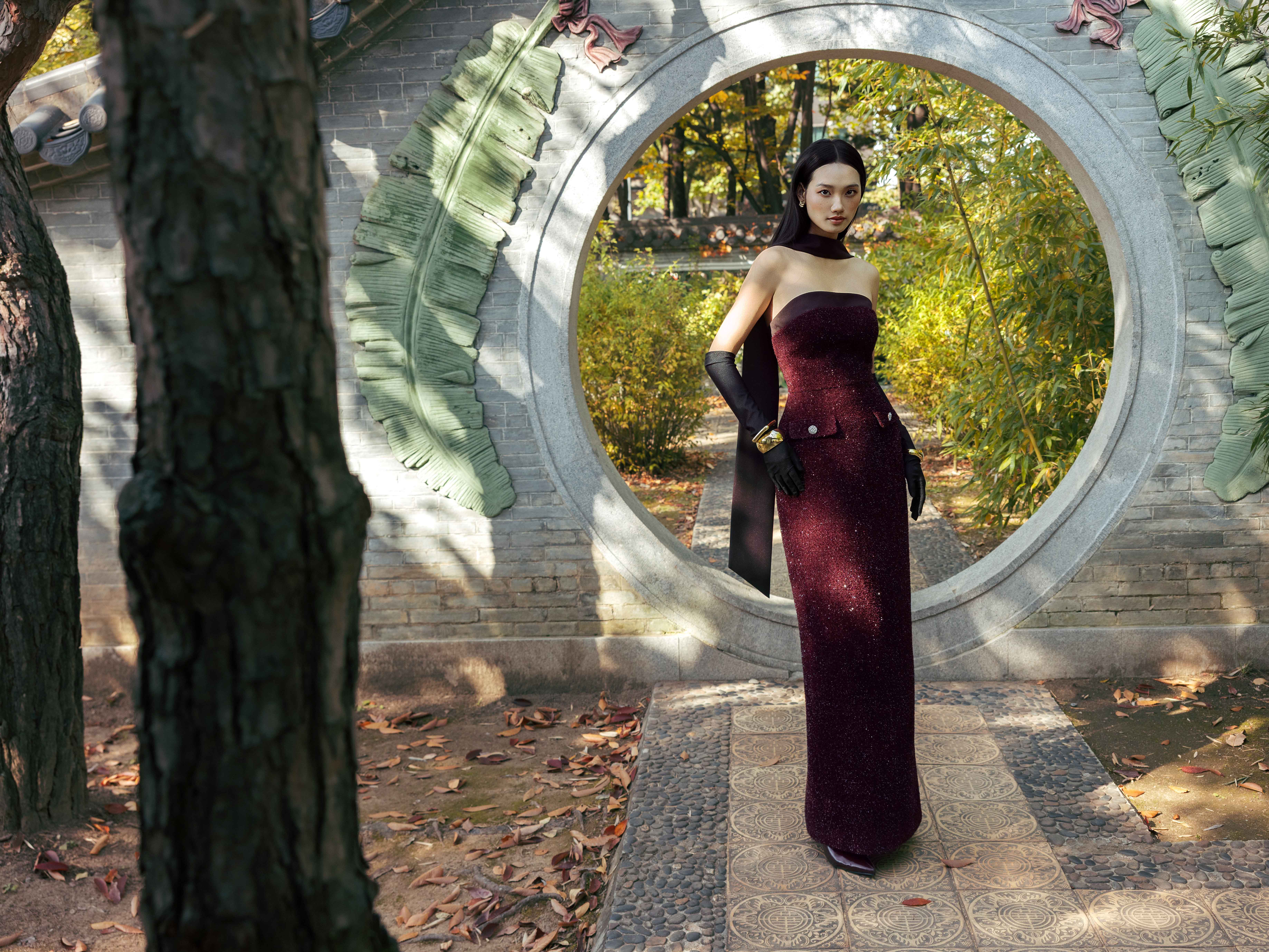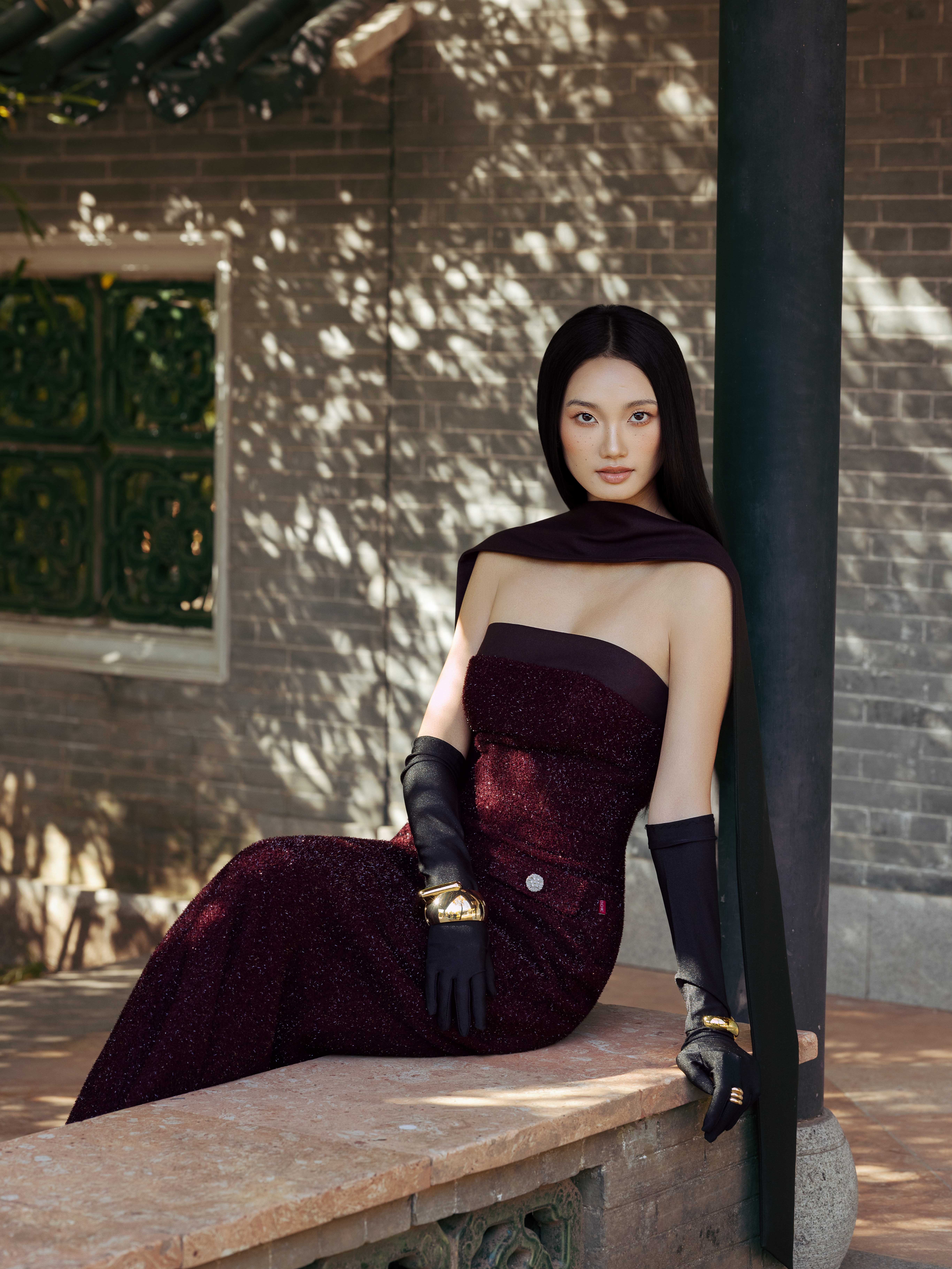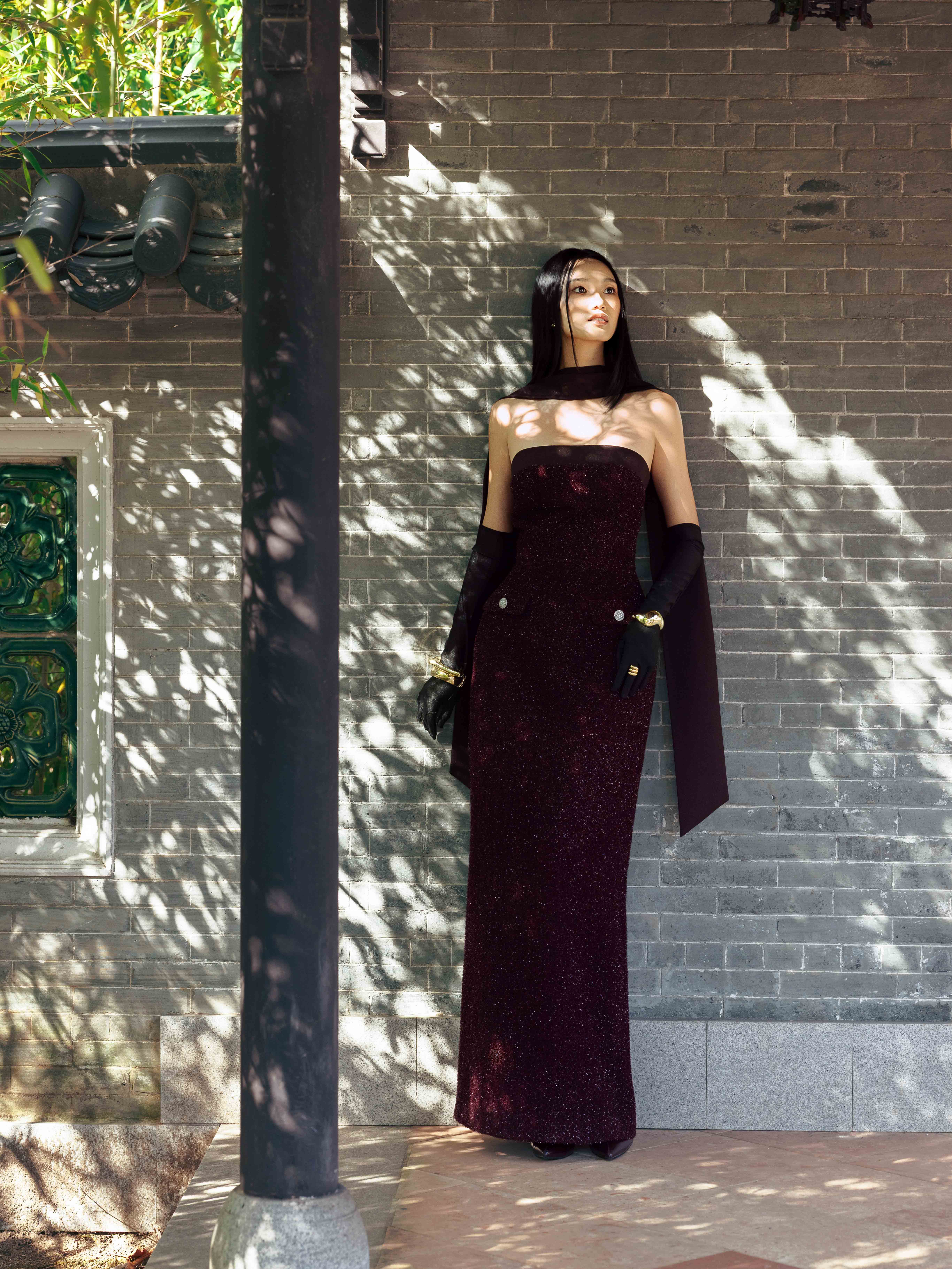 - Chi tiết thiết kế: Kèm khăn dài đen, đính kết sợi hiệu ứng lấp lánh,