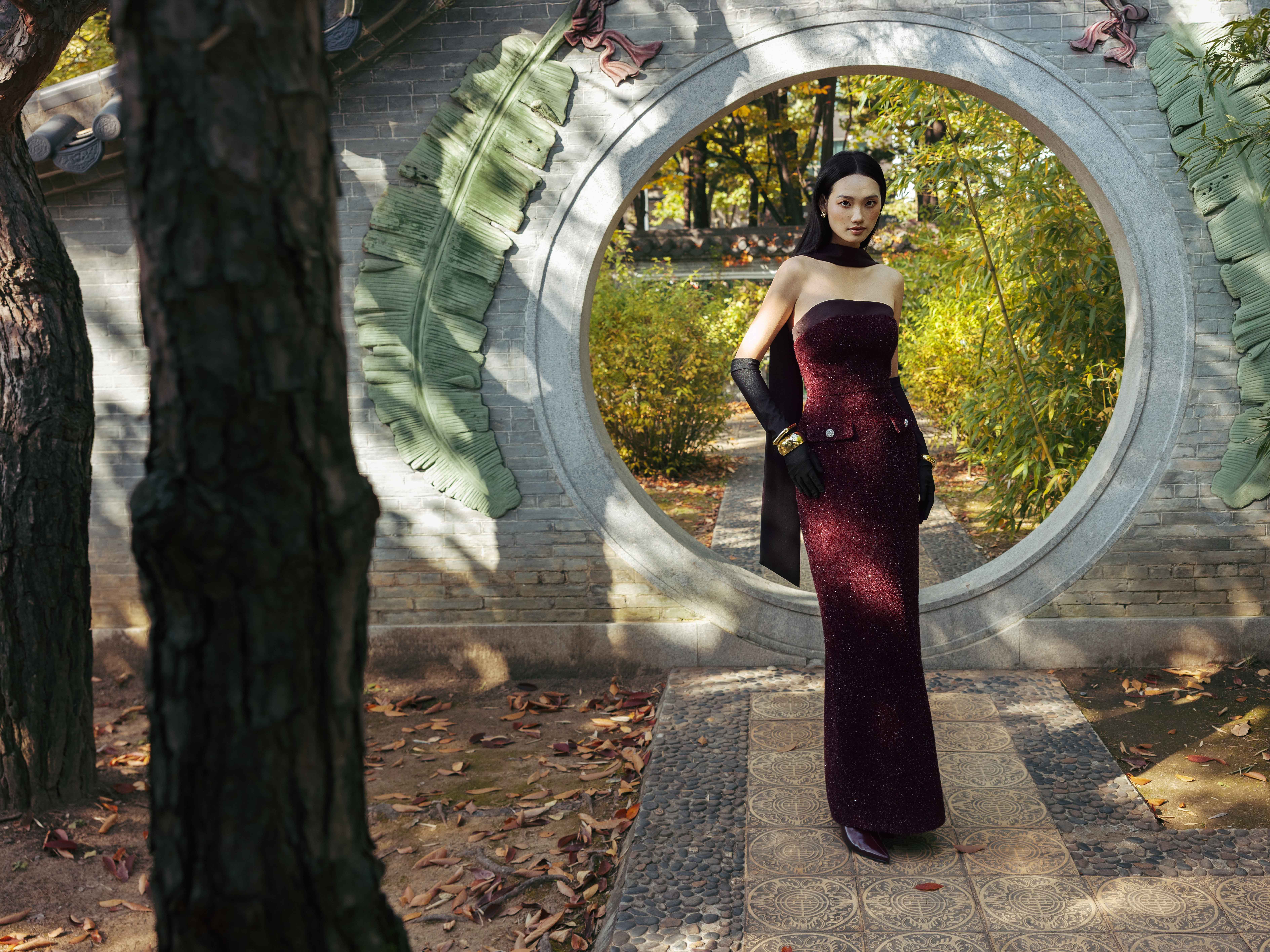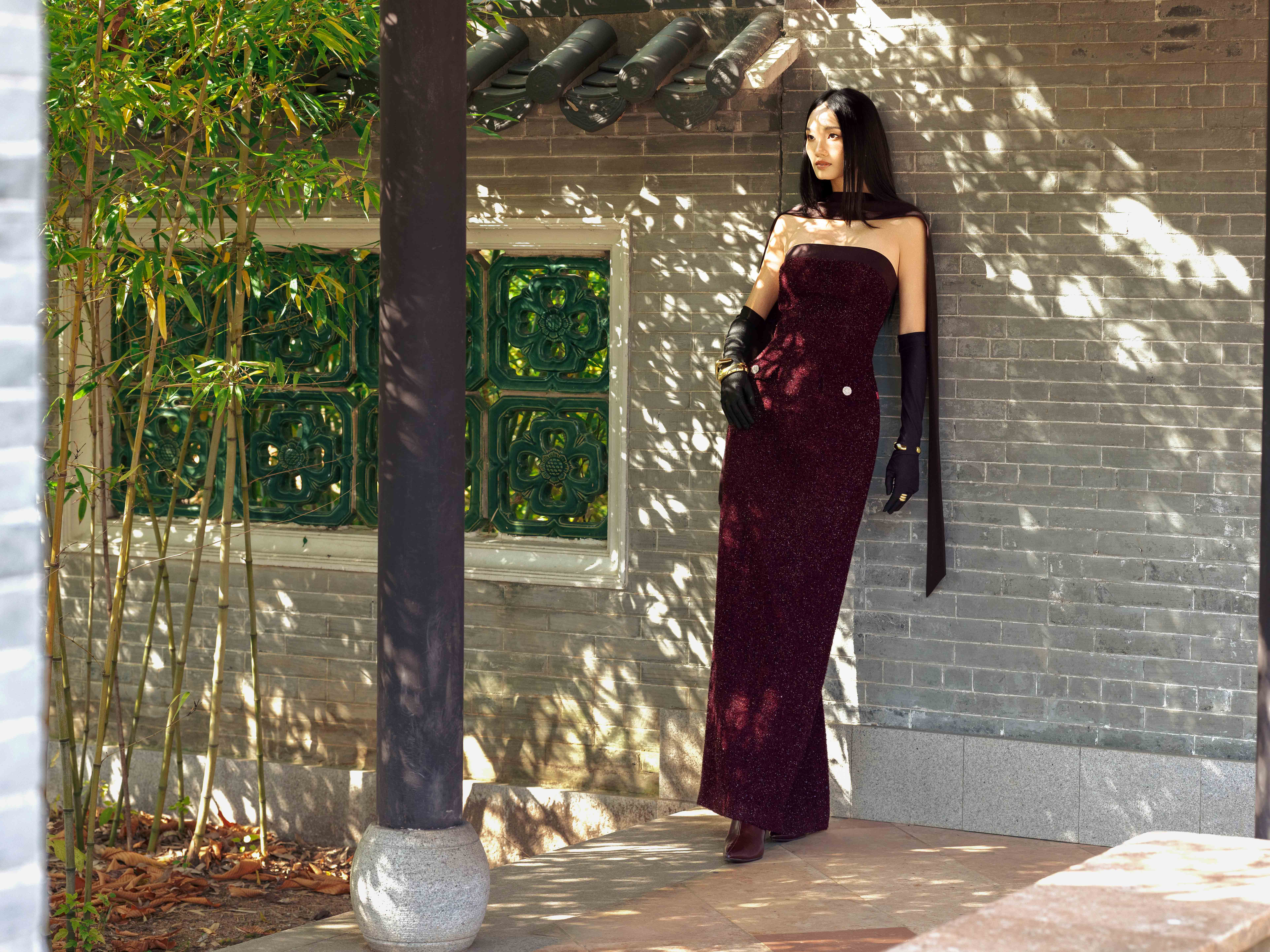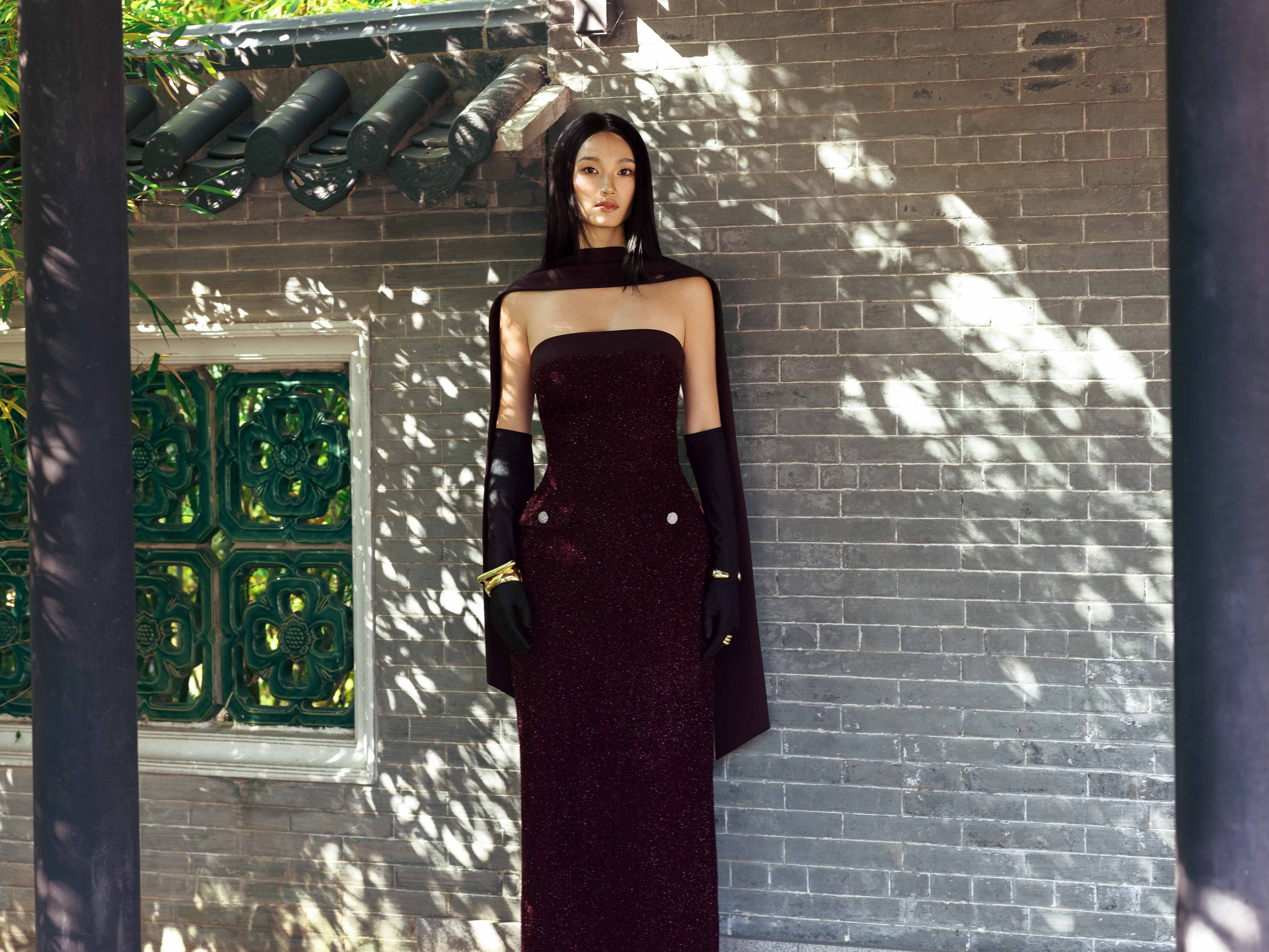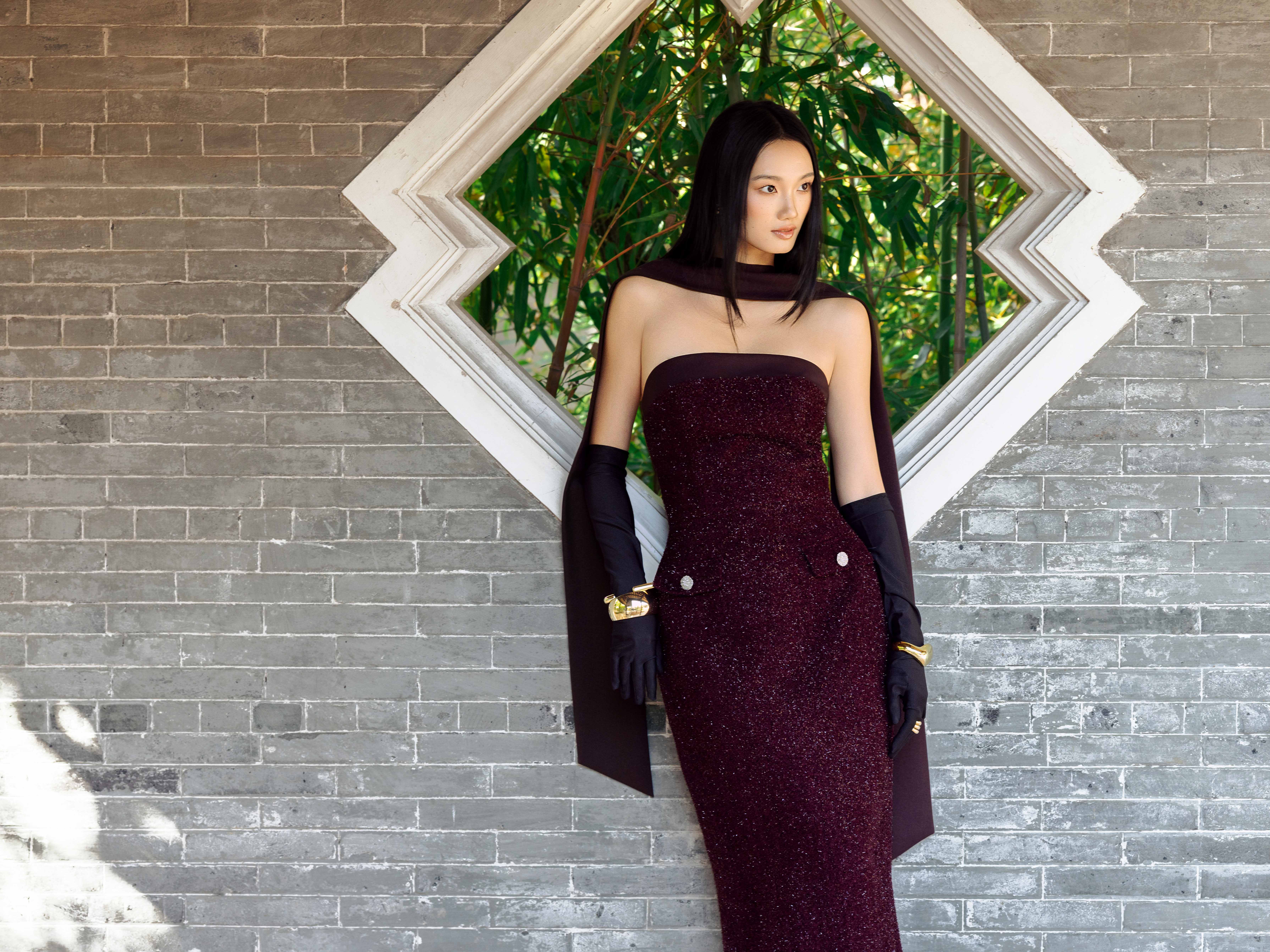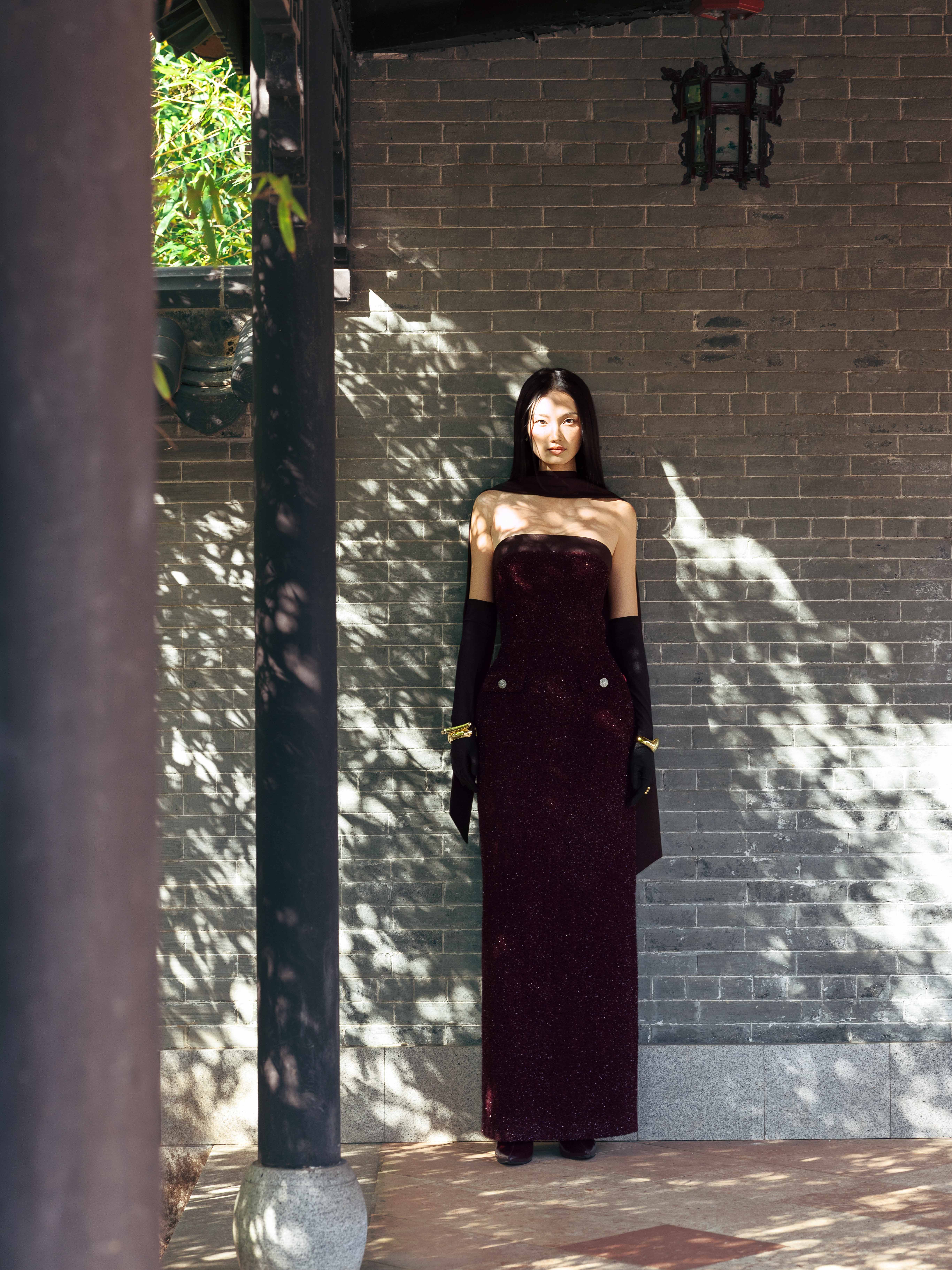 - Chi tiết thiết kế: Kèm khăn dài đen, đính kết sợi hiệu ứng lấp lánh,