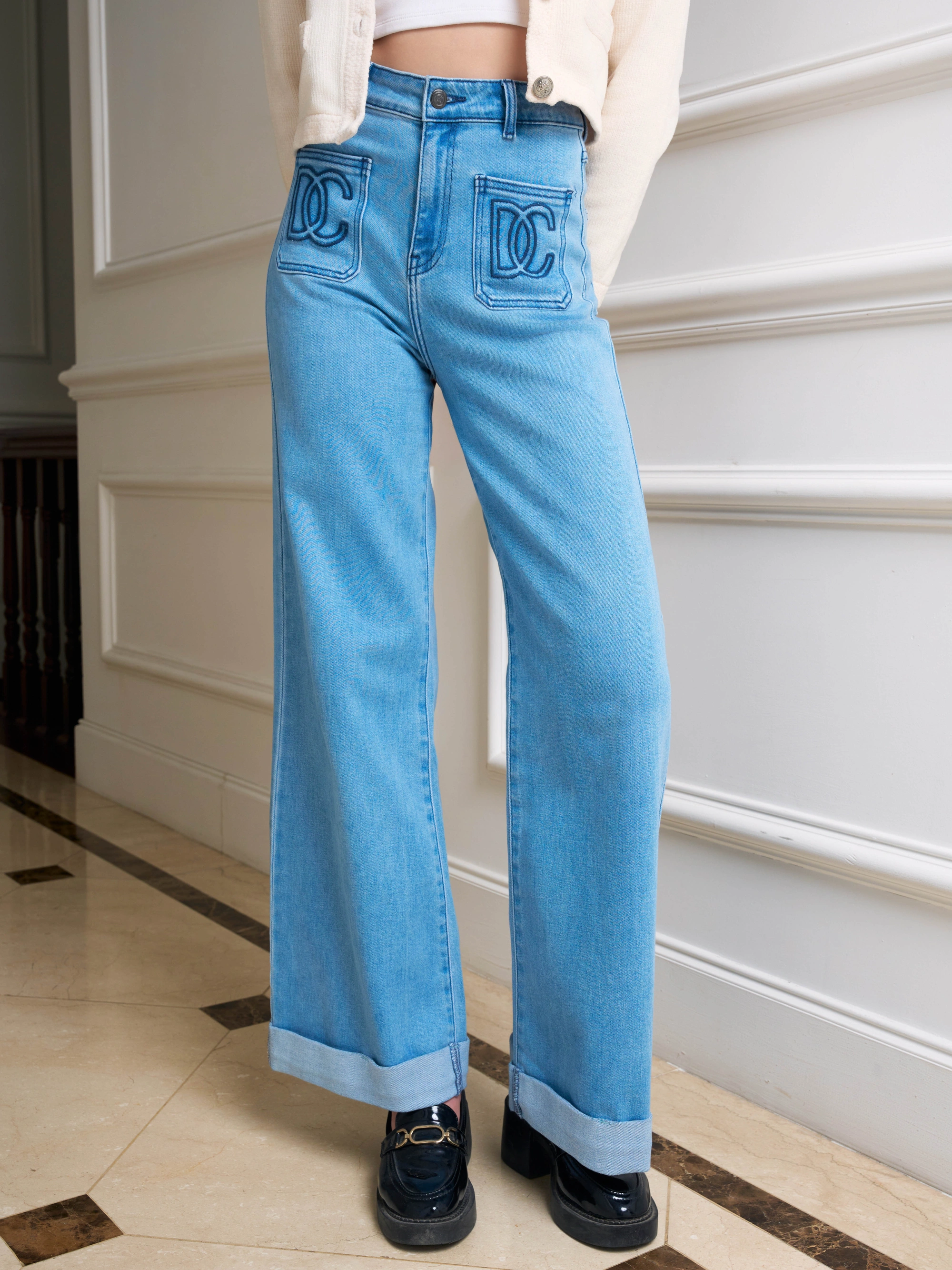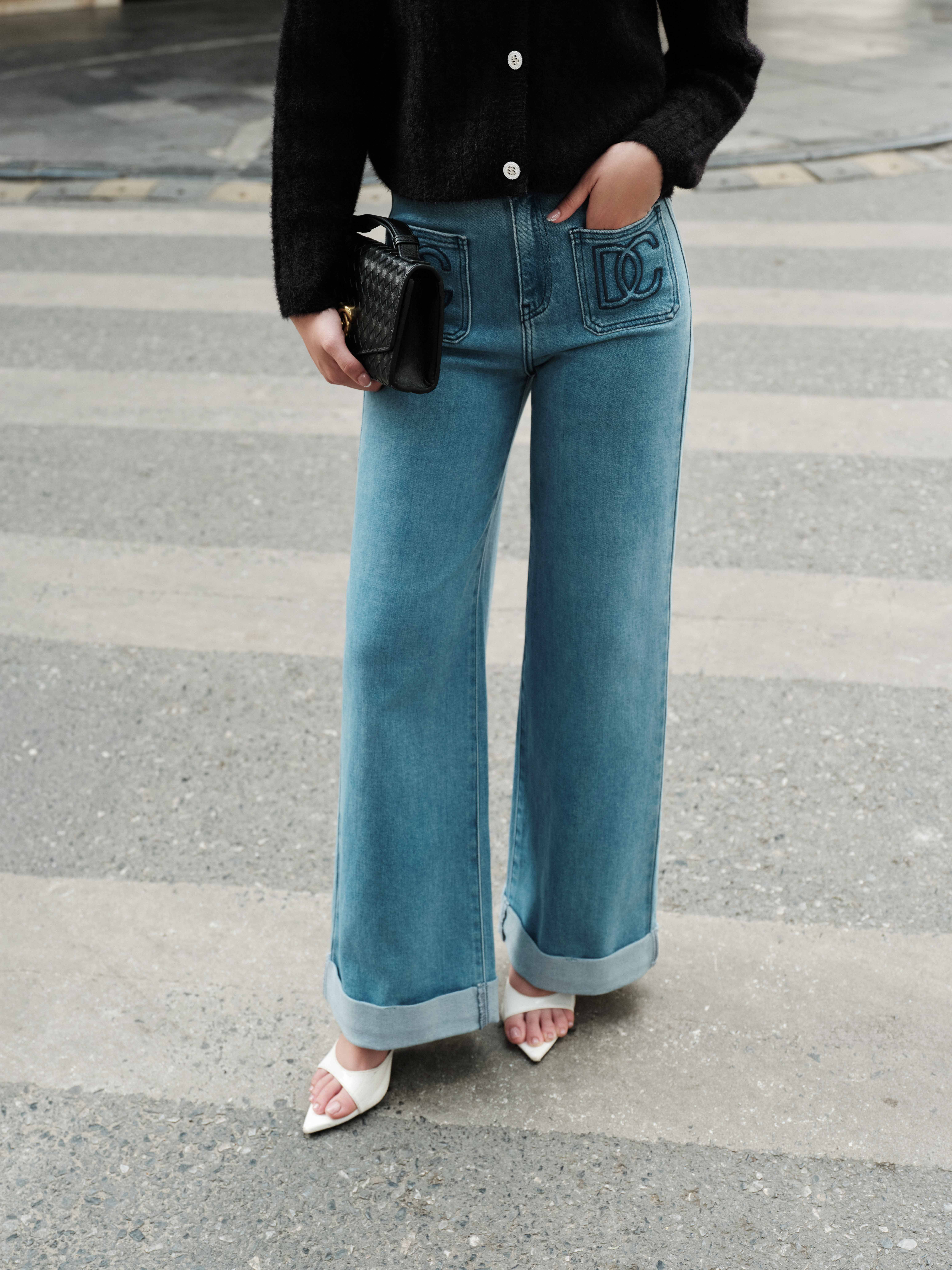 Quần Jean ống suông gấu lật túi thêu DC